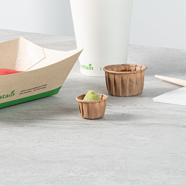 Upgrade your foodservice with our Sustain 0.5-ounce Kraft Paper Portion Cups. These paper condiment cups are commercially compostable and biodegradable, providing an eco-friendly alternative to traditional plastic. Made from premium paper, these condiment cups are durable and ideal for holding ketchup, mustard, mayonnaise, honey, and more. Perfect for serving samples, these versatile paper ketchup cups make an excellent choice for events, tastings, and food promotions. The kraft finish of these ketchup cups complements your food presentation, adding a rustic and appealing touch. For straightforward cleanup, these disposable sauce cups can be tossed after use. With a capacity of 0.5 ounces, these paper sauce cups measure 1.26 inches in diameter by 0.87 inches in height. Sold in a 100 count box. These items will only degrade outside of the traditional solid waste stream.