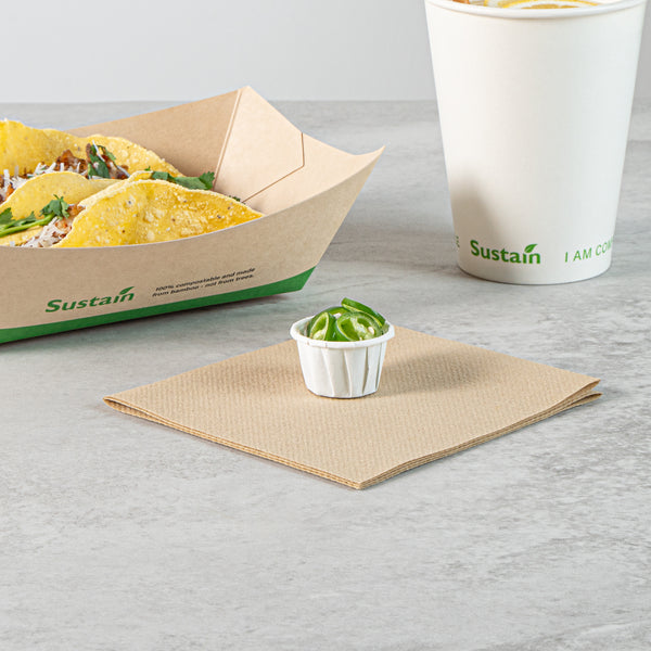 Enhance your foodservice offerings with our Sustain 0.5-ounce White Paper Portion Cups. These paper condiment cups are commercially compostable and biodegradable, providing a sustainable alternative to traditional plastic. Crafted from premium paper, these durable condiment cups are perfect for holding ketchup, mustard, mayonnaise, honey, and other sauces. Designed to be versatile, these paper sauce cups are also ideal for serving samples at events, tastings, and food promotions. The sleek white finish of these ketchup cups complements any food presentation, adding a touch of elegance. For easy cleanup, these disposable sauce cups can be simply tossed after use. Each paper ketchup cup has a capacity of 0.5 ounces and measures 1.26 inches in diameter by 0.87 inches in height. Sold in a 2,000 count box. These items will degrade outside of the traditional solid waste stream.