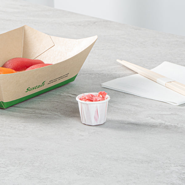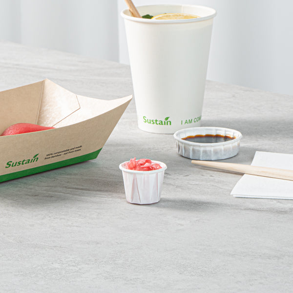 Elevate your foodservice with our Sustain 0.75-ounce White Paper Portion Cups. These paper condiment cups are commercially compostable and biodegradable, offering a sustainable alternative to traditional plastic, making them an excellent choice for environmentally-conscious businesses. Crafted from premium paper, these durable condiment cups are ideal for holding ketchup, mustard, mayonnaise, honey, and more without leaking. These versatile paper ketchup cups are perfect for serving samples at events, tastings, and food promotions, ensuring a neat presentation. The sleek white finish of these paper sauce cups complements any food display, enhancing the overall aesthetic. For hassle-free cleanup, these disposable sauce cups can be easily discarded after use. Measuring 1.34 inches in diameter by 1.1 inches in height, these ketchup cups can hold up to 0.75 ounces. Sold in a 100 count box. These items will only degrade outside of the traditional solid waste stream.