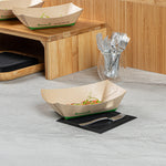 Effortlessly serve and showcase your culinary creations with our Sustain Leak-Resistant Kraft Disposable Food Boat. Designed with a PLA lining, this disposable food boat prevents leaks, ensuring clean and efficient foodservice operations. Crafted from durable paper, it resists bending, maintaining the integrity of sampler presentations in any setting, whether at a bustling food truck or a catered event. Emphasizing sustainability, the boat's commercially compostable design aids in eco-friendly waste management, making it an ideal choice for businesses committed to reducing their environmental footprint. Measuring 4.2 inches in length, 2.7 inches in width, and 1.6 inches in height, this kraft-colored bamboo paper boat combines practicality with an attractive presentation. Upgrade your serving trays with these compostable serving trays and enjoy seamless service. Each order includes 400 Sustain Leak-Resistant Kraft Disposable Food Boats.