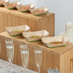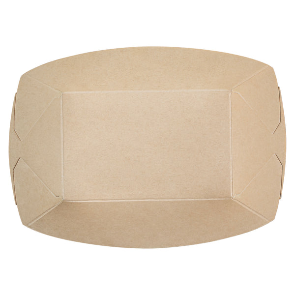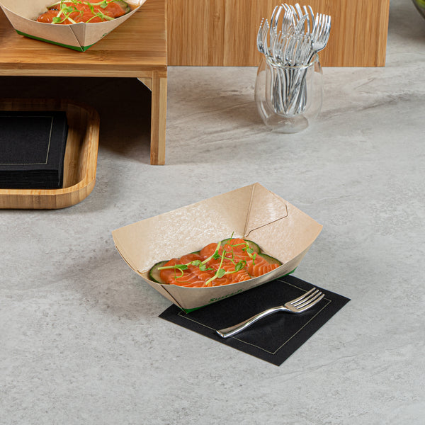 Effortlessly serve and showcase your culinary creations with our Sustain Leak-Resistant Kraft Disposable Food Boat. Designed with a PLA lining, this disposable food boat prevents leaks, ensuring clean and efficient foodservice operations. Crafted from durable paper, it resists bending, maintaining the integrity of sampler presentations in any setting, whether at a bustling food truck or a catered event. Emphasizing sustainability, the boat's commercially compostable design aids in eco-friendly waste management, making it an ideal choice for businesses committed to reducing their environmental footprint. Measuring 4.2 inches in length, 2.7 inches in width, and 1.6 inches in height, this kraft-colored bamboo paper boat combines practicality with an attractive presentation. Upgrade your serving trays with these compostable serving trays and enjoy seamless service. Each order includes 50 Sustain Leak-Resistant Kraft Disposable Food Boats.