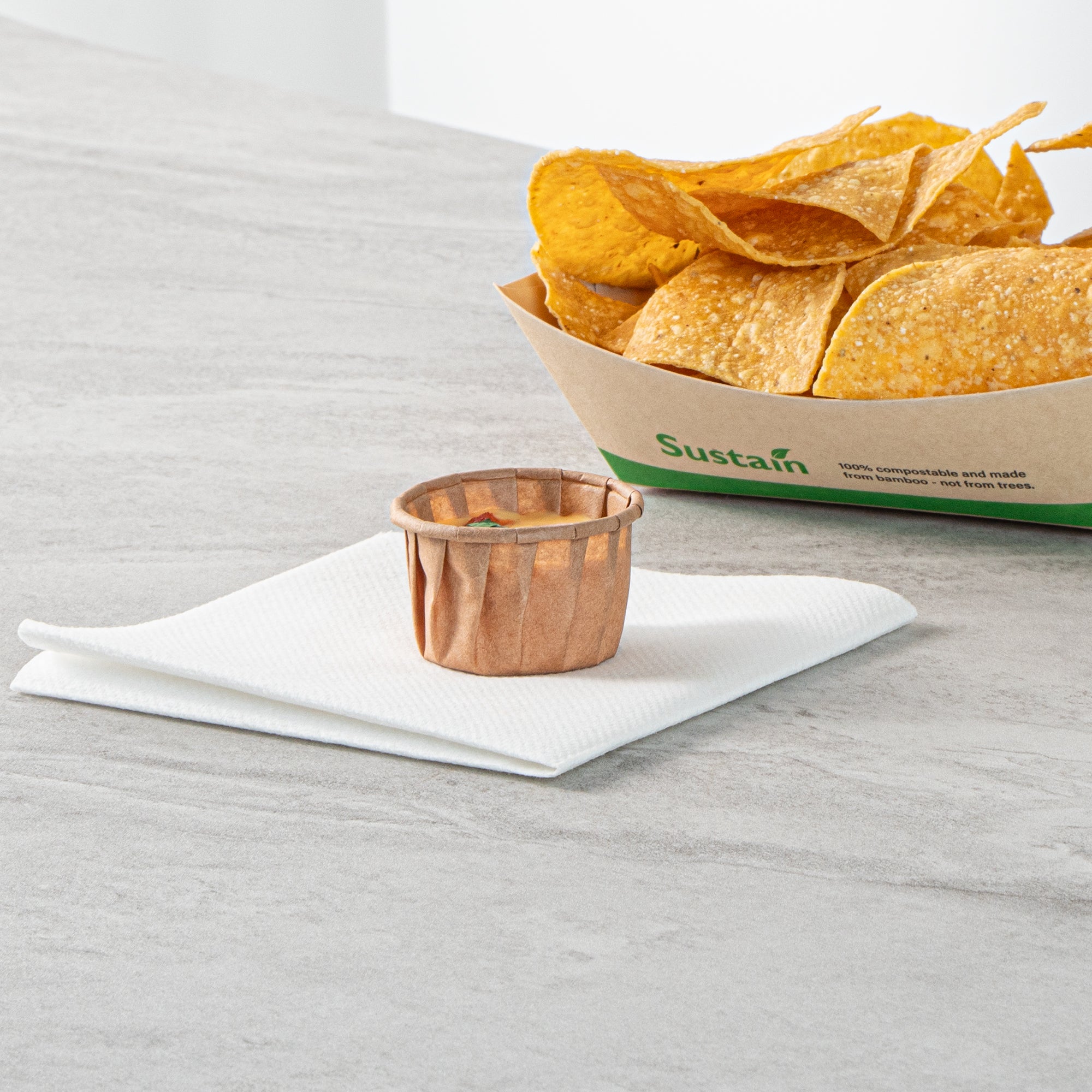 Elevate your foodservice with our Sustain 1.25-ounce Kraft Paper Portion Cups. These paper condiment cups are commercially compostable and biodegradable, providing a sustainable alternative to traditional plastic. Crafted from premium paper, these condiment cups are durable enough to hold ketchup, mustard, mayonnaise, honey, and more without any leaks. With a versatile design, these paper sauce cups are ideal for serving samples at events, tastings, and food promotions. The kraft finish of these ketchup cups adds a rustic charm to your food presentation, enhancing the visual appeal of your offerings. For effortless cleanup, these disposable sauce cups can be simply tossed after use. Measuring 1.69 inches in diameter by 1.18 inches in height, these paper ketchup cups have a capacity of 1.25 ounces. Sold in a 100 count box. These items will only degrade outside of the traditional solid waste stream.