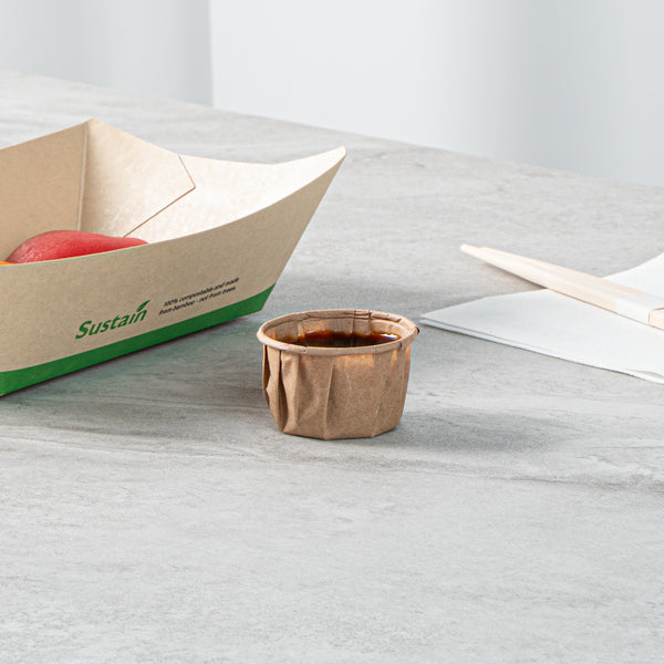 Elevate your foodservice offerings with our Sustain 1.5-ounce Kraft Paper Portion Cups. These paper condiment cups are commercially compostable and biodegradable, making them perfect for environmentally-conscious businesses. Made from premium paper, these condiment cups are durable enough to hold thick barbecue sauce, chunky salsa, and more. Ideal for serving samples, these versatile paper ketchup cups are a great choice for events, tastings, and food promotions. The kraft finish of these paper sauce cups enhances your food presentation with a rustic touch. For a straightforward cleanup, these disposable sauce cups can be easily tossed after use. With a capacity of 1.5 ounces, these ketchup cups measure 1.97 inches in diameter by 1.22 inches in height. Sold in a 2,000 count box. These items will only degrade outside of the traditional solid waste stream.