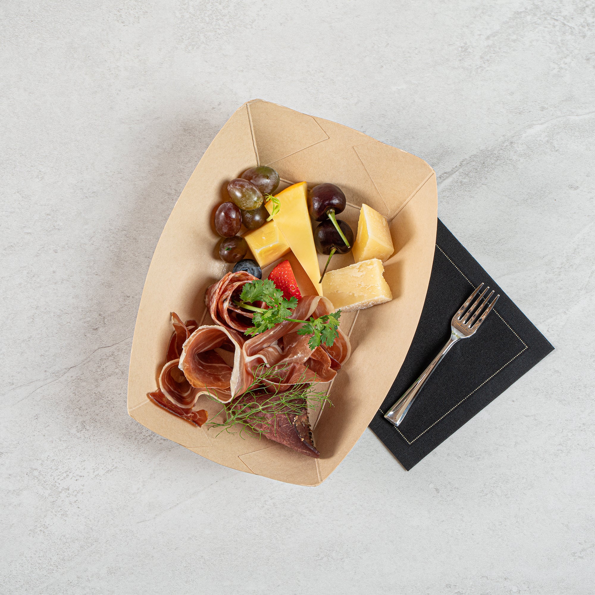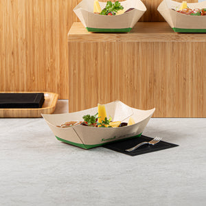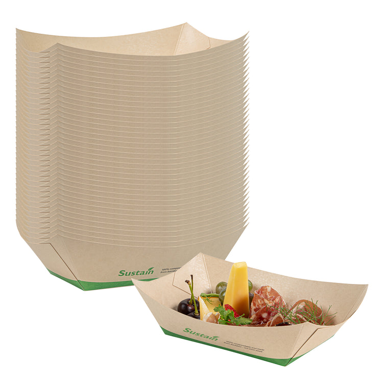 Avoid messy spills with our eco-friendly service solutions. The Sustain Leak-Resistant Bamboo Paper Food Tray features a reliable PLA lining that prevents unwanted leaks, ensuring your delicious meals remain mess-free and appetizing. Made from durable paper, this bamboo paper food tray maintains its shape and stability, allowing you to present and transport your culinary creations confidently without any folding or bending. Its sustainable construction is commercially compostable, facilitating easy and eco-friendly disposal, which is perfect for foodservice operations prioritizing sustainability. Measuring 5.4 inches in length by 3.4 inches in width and 2.1 inches in height, this compostable food boat is ideal for serving a variety of dishes, from appetizers to desserts. Elevate your catering or takeout presentations with this disposable food tray, knowing you're making a positive impact on the environment. Each order includes 200 Sustain Leak-Resistant Bamboo Paper Food Trays.