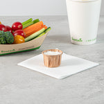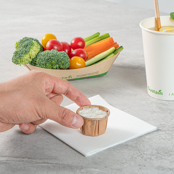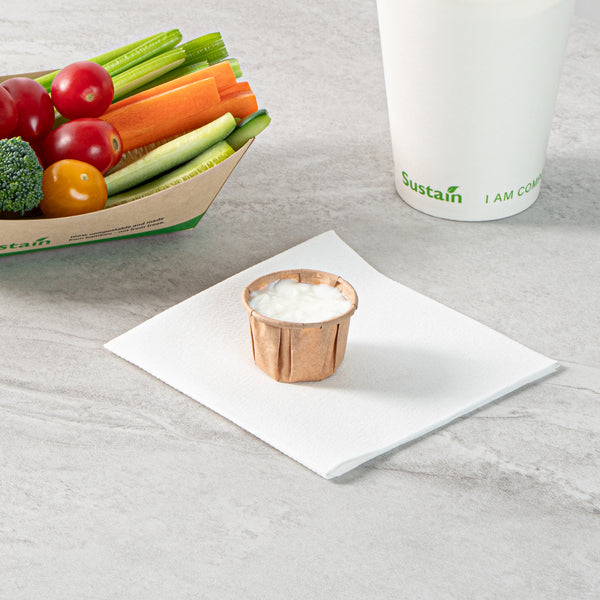 Elevate your food presentation with our Sustain 1-ounce Kraft Paper Portion Cups. These paper condiment cups are commercially compostable and biodegradable, offering a sustainable alternative to traditional plastic. Made from premium paper, these condiment cups are durable and perfect for holding ketchup, mustard, mayonnaise, honey, and more. Ideal for sampling, these versatile paper ketchup cups make an excellent choice for events, tastings, and food promotions. Featuring a stylish kraft finish, these ketchup cups enhance the appearance of your food items. These disposable sauce cups can be easily tossed after use and provide an easy cleaning experience. Each paper sauce cup measures 1.57 inches in diameter by 1.06 inches in heightand has a capacity of 1 ounce. Sold in a 100 count box. These items will only degrade outside of the traditional solid waste stream.