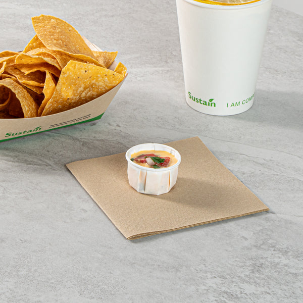 Enhance your foodservice with our Sustain 1-ounce White Paper Portion Cups. These paper condiment cups are commercially compostable and biodegradable, providing a sustainable alternative to traditional plastic. Made from premium paper, these durable sauce cups are ideal for holding ketchup, mustard, mayonnaise, honey, and more. These paper ketchup cups are versatile and perfect for serving samples at events, tastings, and food promotions. The white finish of these paper sauce cups enhances your food presentation, making your dishes look even more appetizing. For hassle-free cleanup, these ketchup cups are disposable and can be easily tossed after use. Measuring 1.5 inches in diameter by 1 inch in height, these condiment cups have a capacity of 1 ounce. Sold in a 2,000 count box. These items will only degrade outside of the traditional solid waste stream.