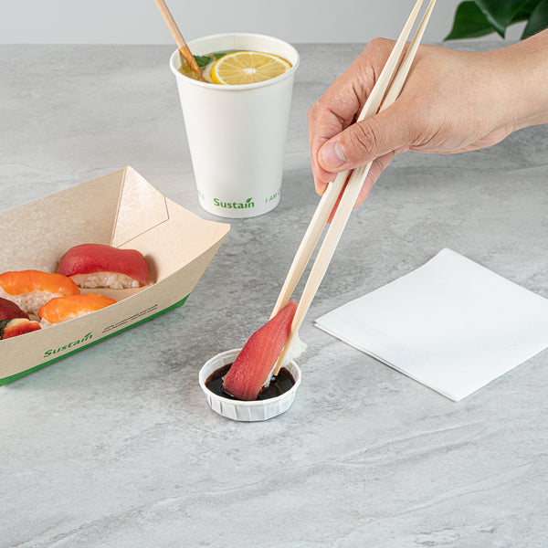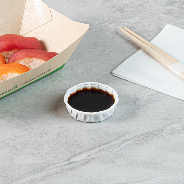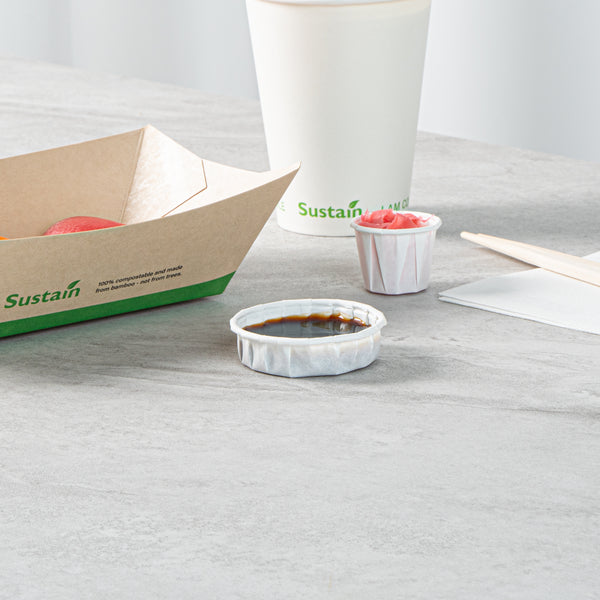 Serve your homemade condiments with our Sustain 1-ounce White Paper Squat Portion Cups. These paper condiment cups are commercially compostable and biodegradable, providing a sustainable alternative to traditional plastic. Made from premium paper, these durable condiment cups hold ketchup, mustard, mayonnaise, honey, and more without leaking. Perfect for serving samples, these versatile sauce cups are ideal for events, tastings, and food promotions. The white finish of these paper ketchup cups enhances your food presentation, making every dish look appetizing. For an easy and straightforward cleanup, these disposable paper sauce cups can be tossed after use. These ketchup cups measure 2.48 inches in diameter by 0.75 inches in height and can hold up to 1 ounce. Sold in a 100 count box. These items will only degrade outside of the traditional solid waste stream.