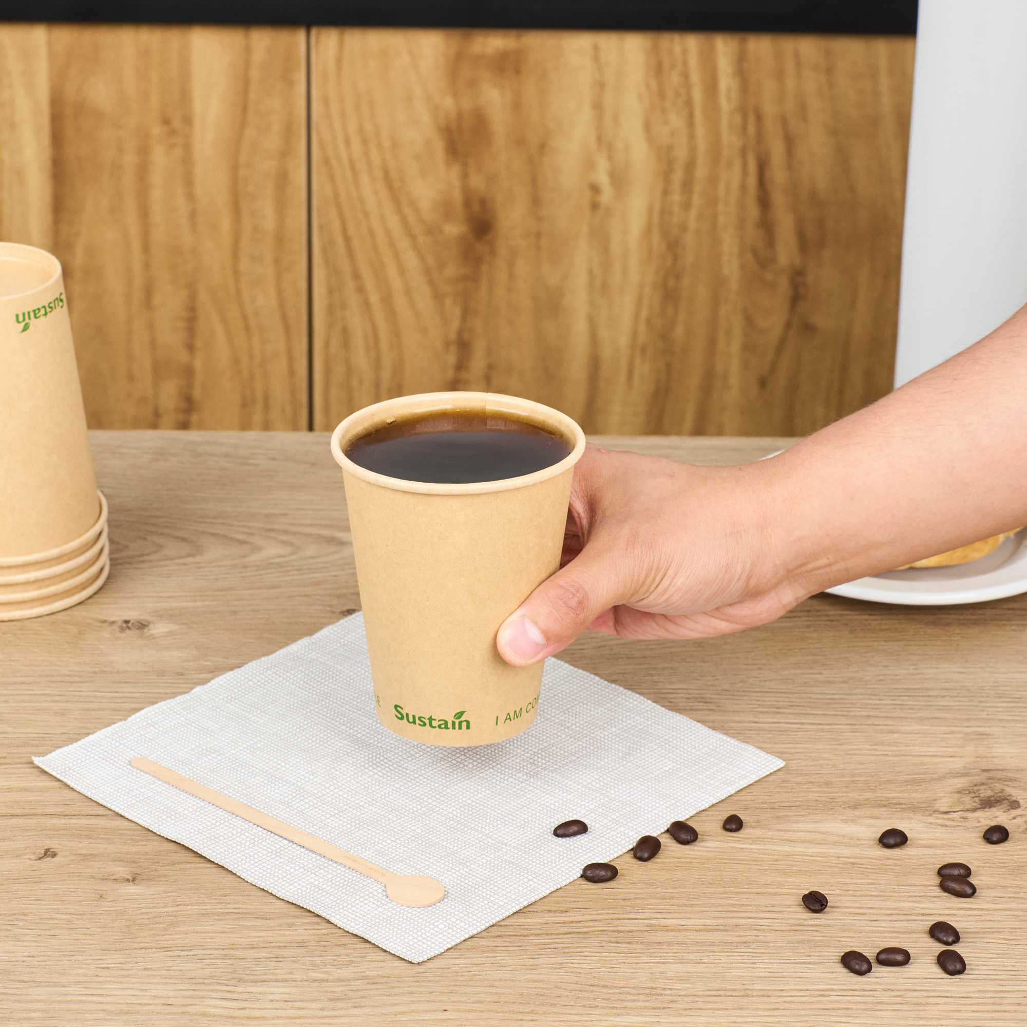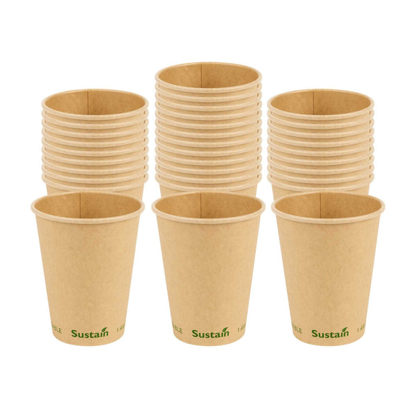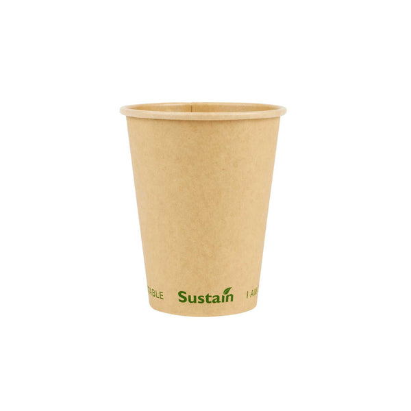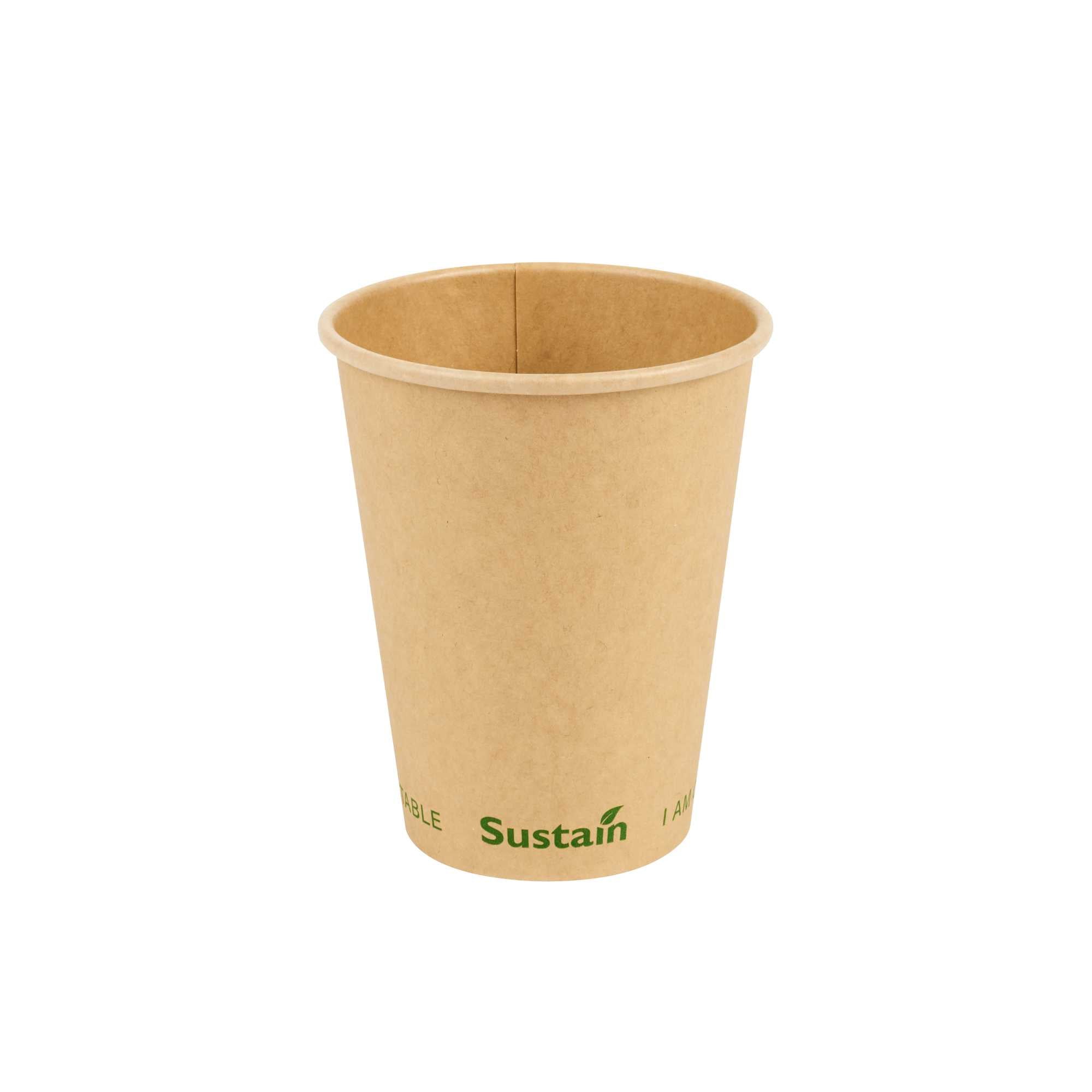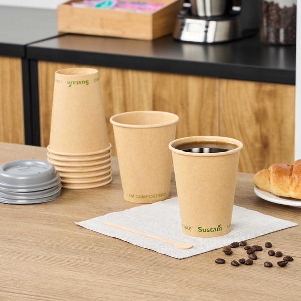 Elevate the experience of your coffee by serving it in our noteworthy Sustain 12-ounce Kraft Paper Coffee Cups. Constructed from top-quality kraft paper, these BPI-certified coffee cups are commercially compostable and biodegradable. These kraft paper coffee cups, sporting a single wall exterior, provide excellent insulation for hot beverages, preserving the warmth inside. Designed with a PLA layer, these disposable coffee cups prevent any leaks. The slightly tapered bottom design makes these single-wall cups easy to stack, making storage a breeze. With a high-temperature tolerance of 212F, these cups are versatile enough for both hot and cold beverages. The "I AM COMPOSTABLE" text on these paper cups ensures that your customers are aware of proper disposal methods. Sip your beverages on the move without a mess, using our perfectly fitting assortment of coffee cup lids. The reinforced edge of these single-wall hot cups stays robust, ensuring a secure fit for the lids. With dimensions of 3.5 inches in diameter by 4.25 inches in height and a capacity of 12 ounces, these compostable cups are perfect for serving a variety of beverages in your cafe, bistro, or kiosk. Shipped in a 1,000 count box. Lids are available and sold separately. These items will only degrade outside of the traditional solid waste stream.