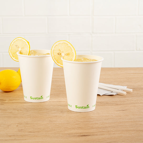Enhance your beverage service with spill-free, eco-friendly options. Sustain 12 Ounce Leak-Resistant Compostable Cold Cups feature a PLA lining that creates a moistureproof barrier, preventing leaks and ensuring every drink stays contained. Made from compostable materials, these cups support sustainable practices, reducing your environmental footprint and aligning with eco-conscious initiatives. With a 12-ounce capacity, these cups are perfect for serving standard-sized cold beverages, catering to customer preferences in quick-service restaurants and cafés. The greaseproof lining is ideal for oily or creamy drinks, maintaining the cup's integrity and appearance. Their white paper construction offers a clean, professional look suitable for any foodservice setting, while the dimensions of 3.54 inches by 3.54 inches by 4.33 inches guarantee compatibility with standard cup holders and lids, enhancing operational efficiency. Each order includes 50 Sustain 12 Ounce Leak-Resistant Compostable Cold Cups.