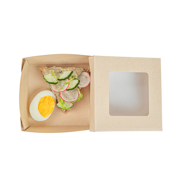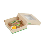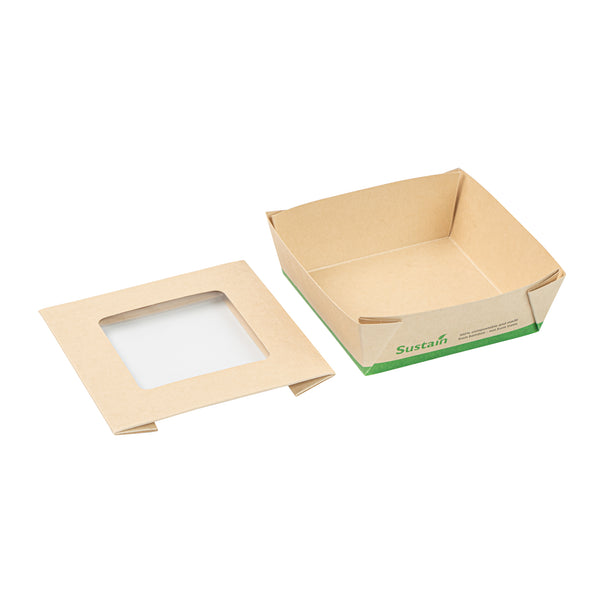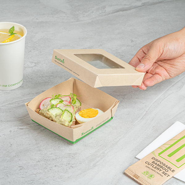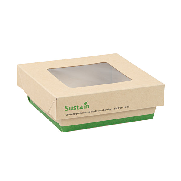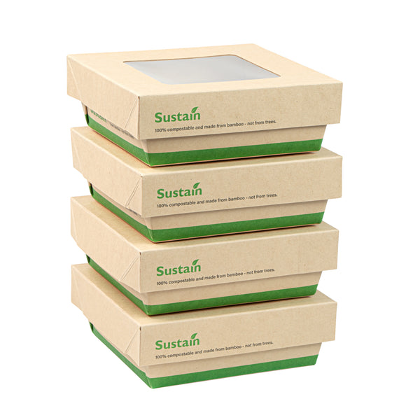 Prevent leaks and showcase your delicious creations effortlessly. Sustain Leak-Resistant Bamboo Paper Takeout Containers feature a PLA lining that prevents leaks, ensuring your 13-ounce meals stay intact during transport. The clear PLA window of these bamboo paper takeout containers enhances visibility, allowing customers to easily view their enticing contents, which can boost impulse purchases. Made from sustainable paper, these compostable takeout containers support eco-friendly disposal practices, aligning with environmentally conscious business goals. Measuring 4.5 inches in length, 4.5 inches in width, and 1.6 inches in height, these disposable food boxes with PLA lining are perfect for a variety of takeout orders. Elevate your foodservice offerings with these biodegradable, greaseproof solutions that promise reliability and clarity. Sold in a 200 count box.
