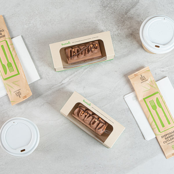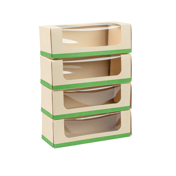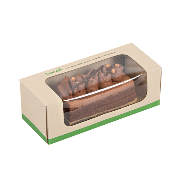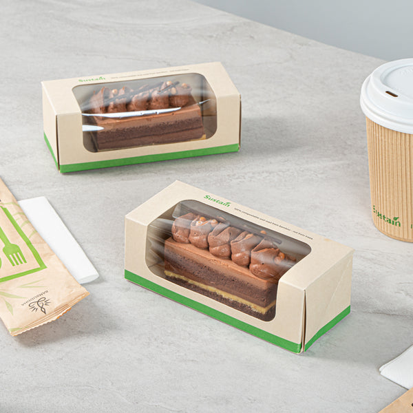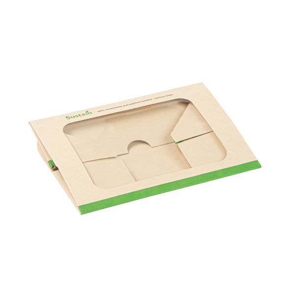 Enhance your eco-friendly foodservice with sustainable packaging solutions. The Sustain Compostable Takeout Box combines practicality with sustainability by featuring a PLA lining that ensures these rectangular food containers are commercially compostable, supporting your green initiatives. The clear PLA window offers an enticing view of your culinary creations, making it easy for customers to see what they are purchasing, while the tab-lock design facilitates quick and secure packing, boosting operational efficiency. Measuring 5.9 inches in length, 2.4 inches in width, and 2 inches in height, these kraft paper boxes are perfect for holding up to 13 ounces of food, making them ideal for a variety of takeout meals. This disposable food container is leak-resistant and greaseproof, making it a reliable choice for preventing spills and maintaining food presentation. Invest in these compostable takeout boxes to elevate your eco-conscious image. Sold in a 200 count box.