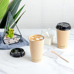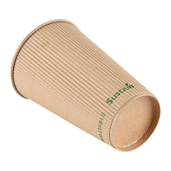 Enhance sustainability with these compostable coffee cups. Sustain 16 oz Kraft Paper Coffee Cups offer a ripple wall design that provides insulation, ensuring a comfortable grip for hot drinks without the need for additional sleeves. These ripple wall coffee cups feature a PLA lining, offering a leak-resistant interior that prevents spills and maintains beverage integrity. Made from kraft paper, they support eco-friendly initiatives by breaking down naturally, reducing environmental impact while providing a rustic, natural aesthetic that appeals to environmentally conscious consumers. With a 16-ounce capacity, these disposable coffee cups are ideal for serving large-sized beverages, accommodating customer preferences in coffee shops and cafés. The freezer-safe feature maintains drink freshness and quality, making them versatile for various foodservice settings. Choose these cups to reinforce your commitment to eco-friendly business practices. Each order includes 25 cups.