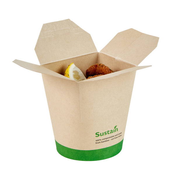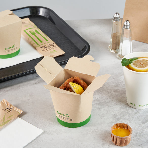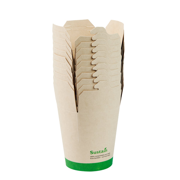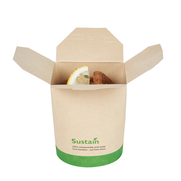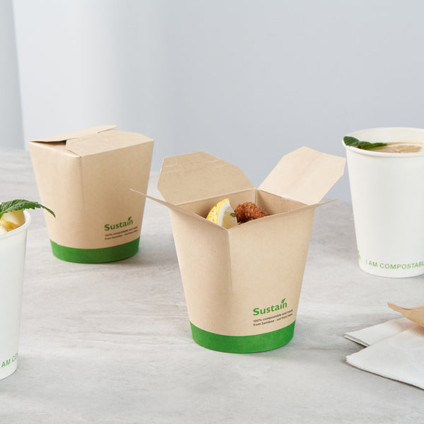 Ensure hassle-free meal delivery with compostable packaging. The Sustain Leak-Resistant Round Noodle Box features a PLA lining that prevents leaks, providing mess-free transport for your takeout services. Designed with a secure tab-lock closure, this round noodle box ensures that meals remain intact during delivery, enhancing customer satisfaction. Made from commercially compostable paper, this eco-friendly takeout container supports sustainable practices and offers an environmentally responsible disposal option. With dimensions of 3.2 inches in length, 2.9 inches in width, and 4 inches in height, this kraft paper box can hold up to 16 ounces, making it ideal for serving generous portions of noodles or rice dishes. Elevate your foodservice operation with reliable and sustainable packaging solutions. Each order includes 200 Sustain Leak-Resistant Round Noodle Boxes.