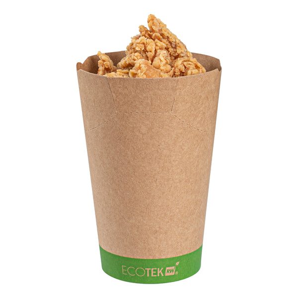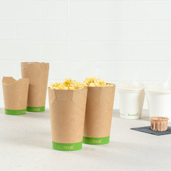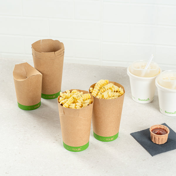 Ensure spill-free service with eco-friendly ease. The Sustain Kraft Paper Fry Cup offers a reliable solution for quick-service restaurants and food trucks needing a sturdy fry container. Made from kraft paper with a PLA lining, it provides a grease-resistant lining that prevents unsightly blotches on surfaces, ensuring clean and appealing presentation. Its 16-ounce capacity is ideal for serving generous portions of fries or onion rings. The inclined rim facilitates quick food serving and scooping, enhancing operational efficiency during busy hours. Supporting sustainability initiatives, this disposable fry cup is made from compostable material, making it an environmentally conscious choice for foodservice establishments. With dimensions of 3.5 inches by 3.5 inches by 4.1 inches, this durable construction maintains the integrity of the container during use. Elevate your takeout service with this sustainable and practical solution. Each order includes 100 Sustain Kraft Paper Fry Cups.