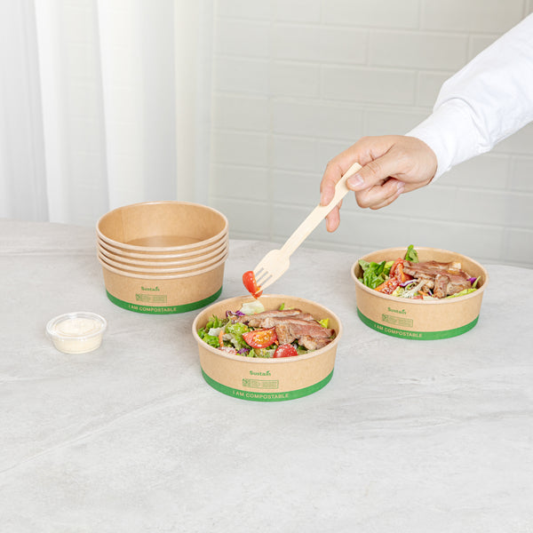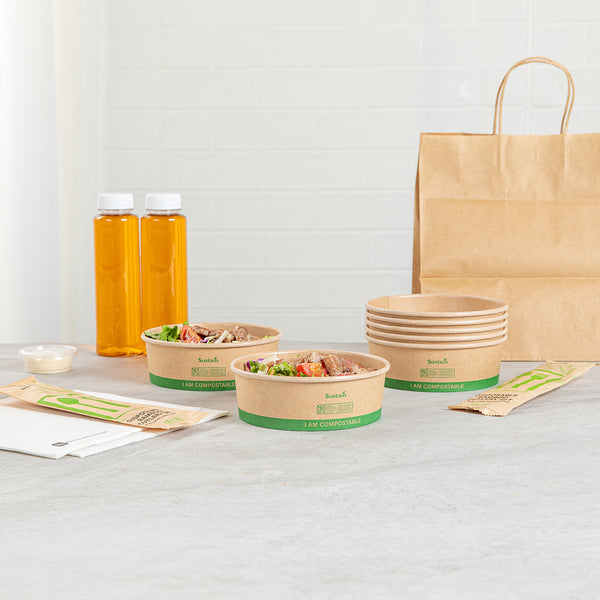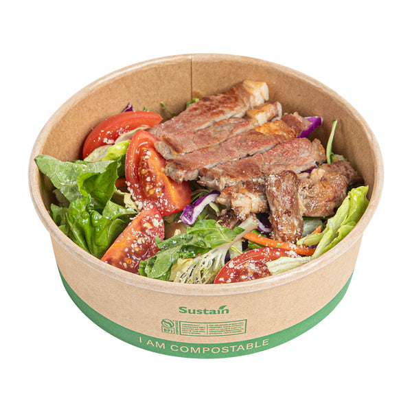 Elevate your food presentation with our Sustain 17-ounce Round Kraft Paper Take Out Containers, designed to meet the needs of eco-conscious foodservice establishments. These paper meal prep bowls are made from commercially compostable paper with BPI certification, contributing to the reduction of waste and the minimization of your carbon footprint. With a grease-resistant PLA lining, these disposable salad bowls prevent oil from soaking through, ensuring a neat and appetizing food presentation. Stackable kraft food containers offer easy storage, making them perfect for busy kitchens and efficient operation. Suitable for serving both hot and cold dishes, these to go containers maintain the quality and temperature of your meals. Providing ample space with a capacity of 17 ounces, these takeaway boxes measure 5.87 inches in diameter width by 1.99 inches in height, ideal for a variety of dishes. Sold in a 200 count box.