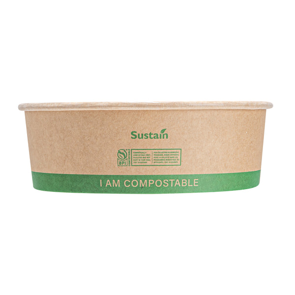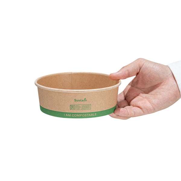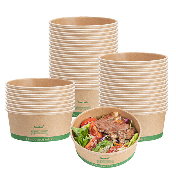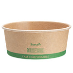 Elevate your food presentation with our Sustain 17-ounce Round Kraft Paper Take Out Containers, designed to meet the needs of eco-conscious foodservice establishments. These paper meal prep bowls are made from commercially compostable paper with BPI certification, contributing to the reduction of waste and the minimization of your carbon footprint. With a grease-resistant PLA lining, these disposable salad bowls prevent oil from soaking through, ensuring a neat and appetizing food presentation. Stackable kraft food containers offer easy storage, making them perfect for busy kitchens and efficient operation. Suitable for serving both hot and cold dishes, these to go containers maintain the quality and temperature of your meals. Providing ample space with a capacity of 17 ounces, these takeaway boxes measure 5.87 inches in diameter width by 1.99 inches in height, ideal for a variety of dishes. Sold in a 50 count box.