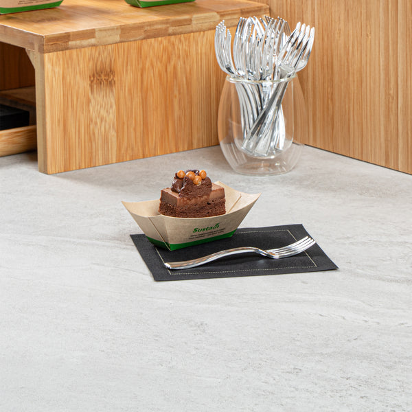 Ensure seamless service with leak-resistant food trays. The Sustain Leak-Resistant Bamboo Paper Food Tray combines a PLA lining with sturdy paper construction to prevent unwanted leaks and maintain the integrity of your dishes. With dimensions of 2 inches in length, 0.8 inches in width, and 1.2 inches in height, these bamboo paper food trays are compact yet robust, ensuring a stable presentation of your culinary creations. Crafted from kraft paper, these trays are commercially compostable, providing an eco-friendly disposal option for environmentally-conscious establishments. The kraft paper boat design resists folding or bending, making it ideal for serving neat samplers without compromising on presentation. Elevate your foodservice operations by choosing this compostable paper tray to impress your guests while reducing your environmental footprint. Each order includes 400 Sustain Leak-Resistant Bamboo Paper Food Trays.