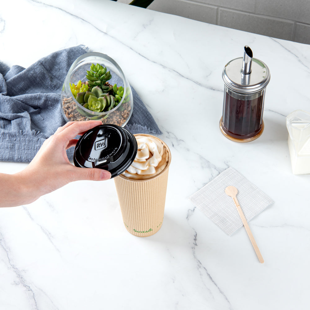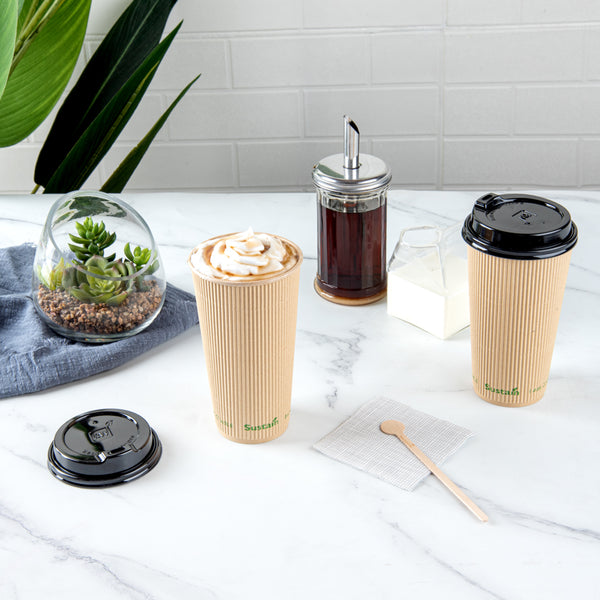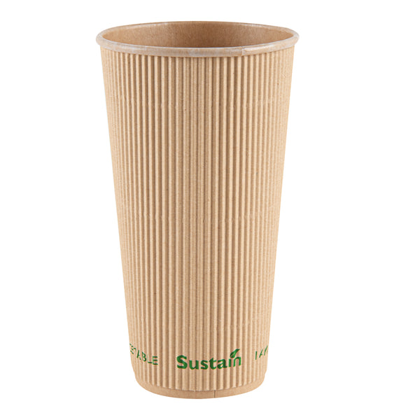 Upgrade your beverage service with eco-friendly options. The Sustain 20 oz Kraft Paper Coffee Cup combines a ripple wall design that insulates beverages to stay hot longer with a non-slip grip, eliminating the need for sleeves, making it a standout ripple wall coffee cup. Crafted from kraft paper with a compostable PLA lining, this disposable coffee cup offers a leak-resistant barrier that ensures no spills, enhancing the customer experience. With a generous 20-ounce capacity, it is perfect for serving large coffee servings, catering to customer preferences for more substantial drinks. The compostable build supports eco-friendly disposal practices, appealing to environmentally conscious consumers and offering a sustainable solution to foodservice professionals. Measuring 3.5 inches in diameter and 6.3 inches in height, this cup is designed for coffee shops and event caterers who prioritize sustainability and functionality. Each order includes 10 cups.