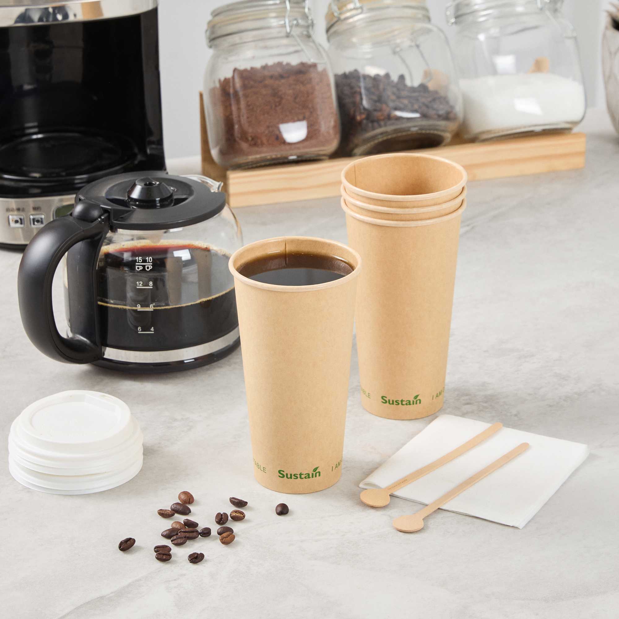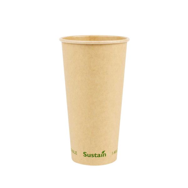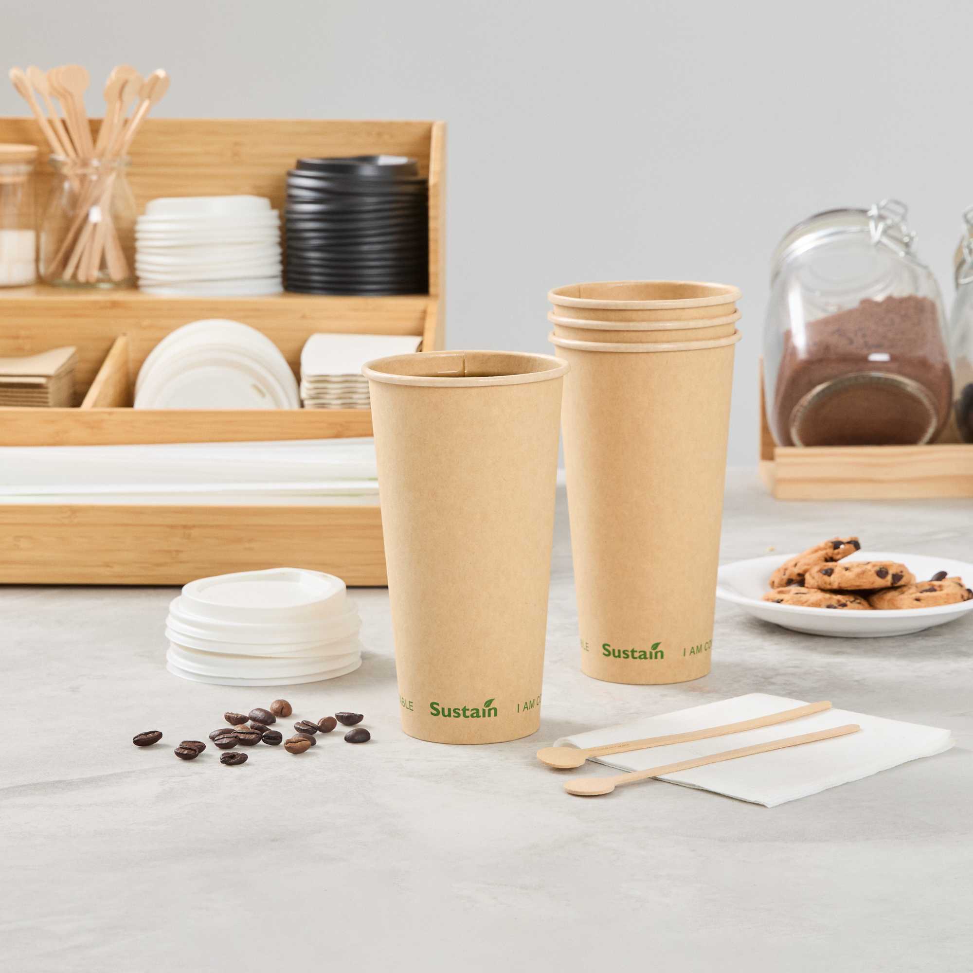 Relish hot or cold coffee using our Sustain 20-ounce Kraft Paper Coffee Cups. An eco-friendly approach is emphasized to your customers with the "I AM COMPOSTABLE" imprint on these cups, indicating their commercial compostability. The single-wall design of these kraft paper coffee cups includes insulation, retaining heat inside the cup, and maintaining the hot contents. These disposable cups exhibit superior endurance with their top-quality kraft paper construction and a PLA coating that ensures leak-proof usage and avoids condensation build-up. With a firm rolled edge and a slightly tapered bottom finish, these single-wall coffee cups are stackable, retaining their form while conserving storage space. These BPI-certified coffee cups have a temperature tolerance of up to 212F, making them suitable for hot or cold beverages alike. For an orderly drinking experience, pair these cups with our assortment of corresponding coffee cup lids. With dimensions of 3.5 inches in diameter by 6.25 inches in height, these hot paper cups offer a 20-ounce capacity, perfect for serving large beverages in your café, diner, or kiosk. Shipped in a 50 count box. Lids are available and sold separately. These items will only degrade outside of the traditional solid waste stream.