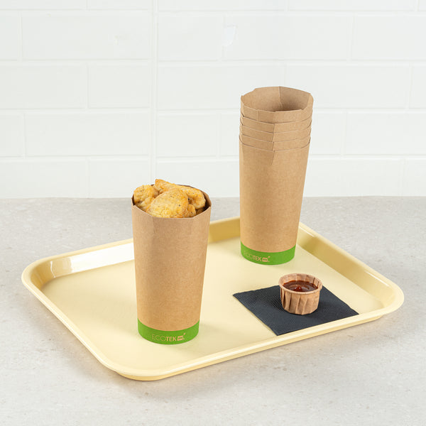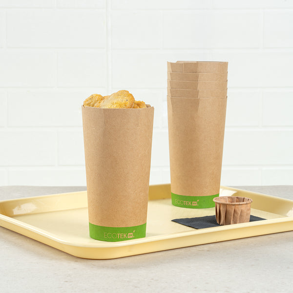 Elevate your take out presentation with our Sustain 20-ounce Round Kraft Paper To Go Fry Cups. The grease-resistant PLA lining of these charcuterie cups prevents oil and grease from seeping through, ensuring a mess-free and enjoyable snacking experience. These disposable paper cups are commercially compostable and biodegradable, providing an environmentally-responsible choice for serving snacks. Made from thick paper, these durable paper cups securely hold your snacks without any risk of tearing. With a kraft finish, these rustic food cups add a stylish look to any food presentation. After use, these disposable cups can be discarded for a straightforward cleanup, making them ideal for busy foodservice environments. Holding a generous capacity of 20 ounces, these snack cups measure 3.35 inches in diameter by 4.92 inches in height, perfectly sized for a variety of snacks. Sold in a 100 count box. These items will only degrade outside of the traditional solid waste stream.
