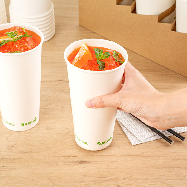 Enhance your beverage service with eco-friendly drinkware solutions. Sustain Compostable Paper Cold Cups boast a PLA lining that creates a leak-resistant barrier, ensuring your 20-ounce cold beverages are securely contained without messy spills. The compostable design supports eco-friendly operations and branding, making these biodegradable paper cups an excellent choice for establishments prioritizing sustainability. Ideal for serving smoothies, iced drinks, and more, these cold food-friendly cups are perfect for quick-service restaurants and food courts. Constructed from white paper with a tightly-rolled rim, these cups provide a clean appearance and a comfortable drinking experience that enhances customer satisfaction. With dimensions of 3.54 inches by 3.54 inches by 6.26 inches, these PLA-lined cups are compatible with standard lids, ensuring spill-free transport. Choose these cups to reinforce your commitment to the environment. Each order includes 50 Sustain Leak-Resistant 20 oz Compostable Paper Cold Cups.
