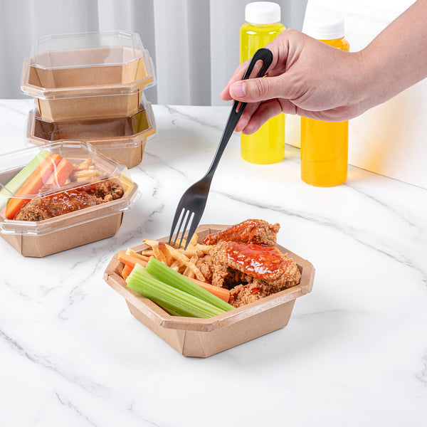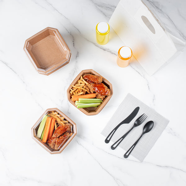The octagonal shape of these take out containers optimizes space utilization, allowing for efficient packing. Plus, the geometric design elevates the food presentation.