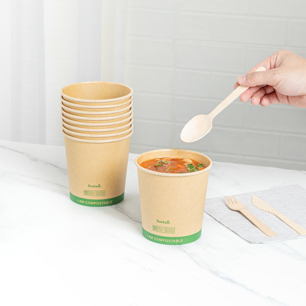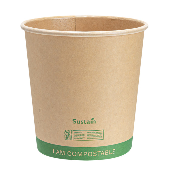 Elevate your food presentation with our Sustain 24-ounce Round Kraft Paper Soup Containers, designed to meet all your serving needs. These kraft soup containers are BPI-certified commercially compostable, significantly reducing waste and minimizing your carbon footprint. Leak-resistant design of this paper food cup ensures safe transportation, preventing messes and allowing you to serve soups, stews, noodles, and more at any temperature. Crafted from durable paper, these take out soup bowls are perfect for serving both hot and cold foods with ease. These to go food containers are stackable, making them ideal for easy storage in busy kitchens. Measuring 4.53 inches in diameter by 4.45 inches in height, this hot food paper cup boasts a generous 24-ounce capacity, perfectly catering to large portions. Sold in a 25 count box.