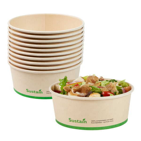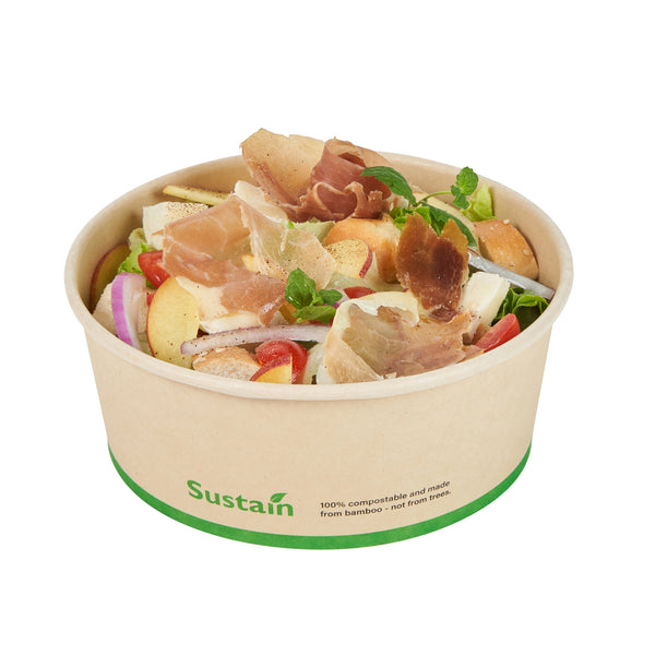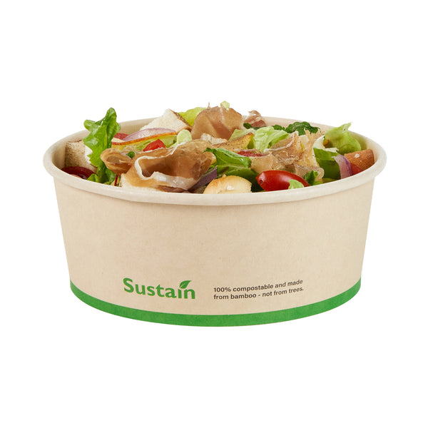 Ensure flawless food presentation with leak-resistant packaging. The Sustain Leak-Resistant Round Paper Salad Bowl combines eco-friendly design with practical functionality, featuring a PLA lining that prevents leaks for mess-free meals. Its 5.9-inch diameter and 2.4-inch height make this round paper salad bowl ideal for serving generous portions of salads or grain bowls. Crafted from sustainable paper, this disposable salad container offers an eco-friendly disposal option as it is commercially compostable, aligning with environmentally conscious business practices. Make the switch to sustainable serving with confidence. Each order includes 50 Sustain Leak-Resistant Round Paper Salad Bowls.