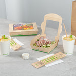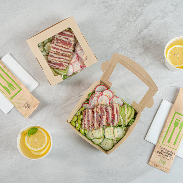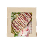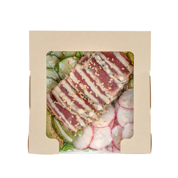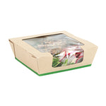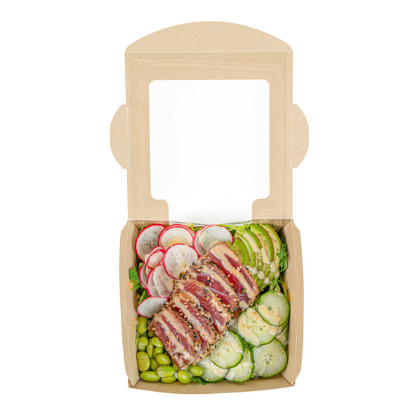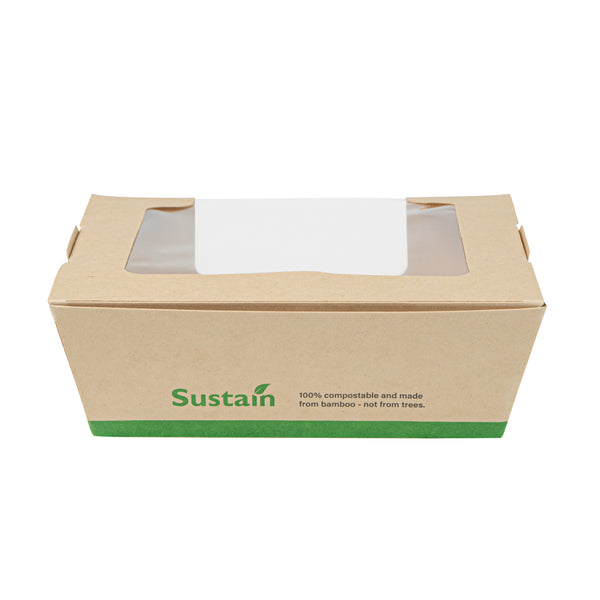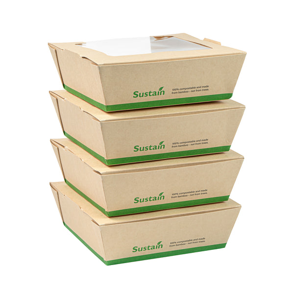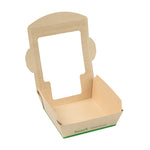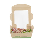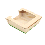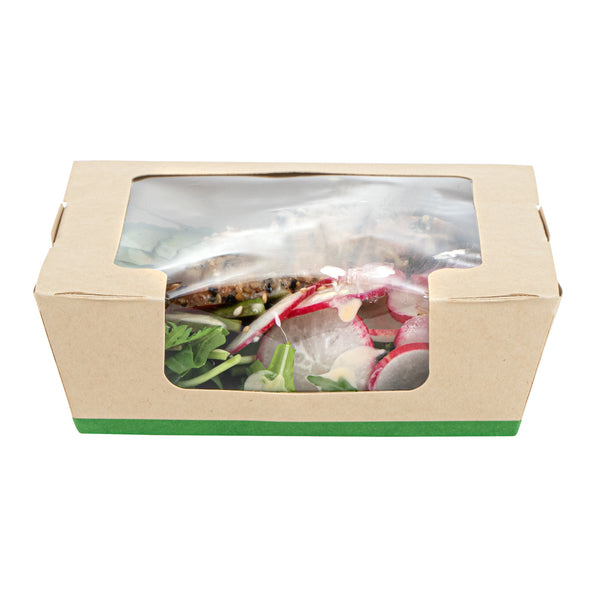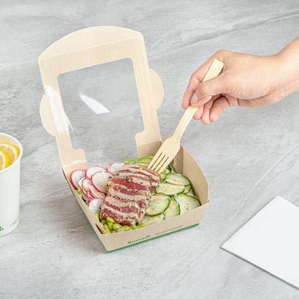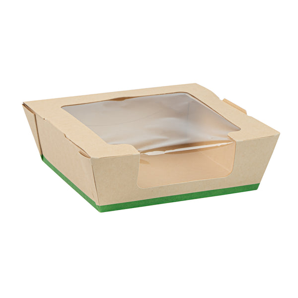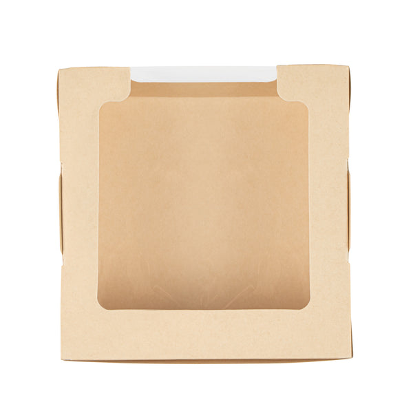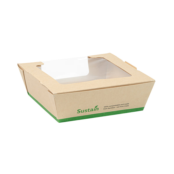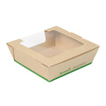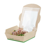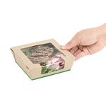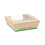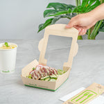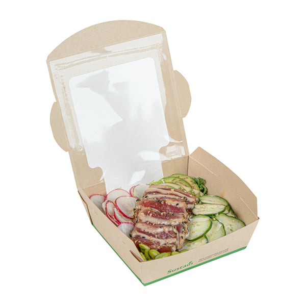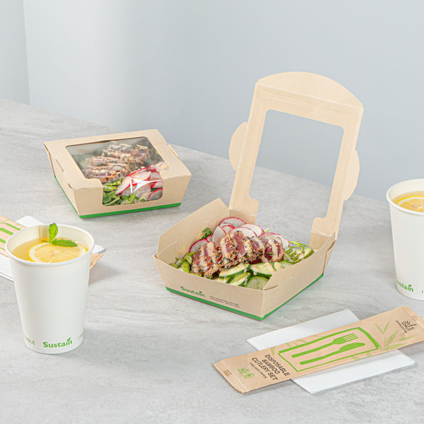 Ensure sustainable service with our compostable food container. The Sustain Leak-Resistant Kraft Paper Compostable Food Container features a PLA lining that prevents leaks, offering a reliable solution to protect baked goods and maintain presentation. With its clear PLA window, this kraft salad box not only showcases enticing contents but also boosts sales by attracting customer attention. Made from commercially compostable paper, this leakproof salad box ensures an eco-friendly disposal, aligning with environmentally conscious business practices. Its dimensions of 5.7 inches in length, 5.7 inches in width, and 1.8 inches in height provide ample space for various dishes while maintaining a compact, space-efficient design. Enhance your establishment's sustainability efforts with this biodegradable, greaseproof container. Sold in a 200 count box.
