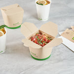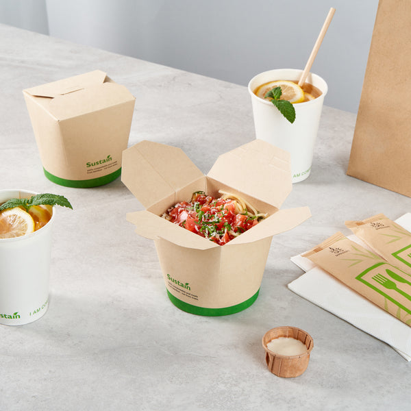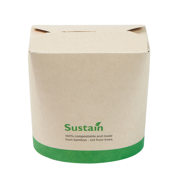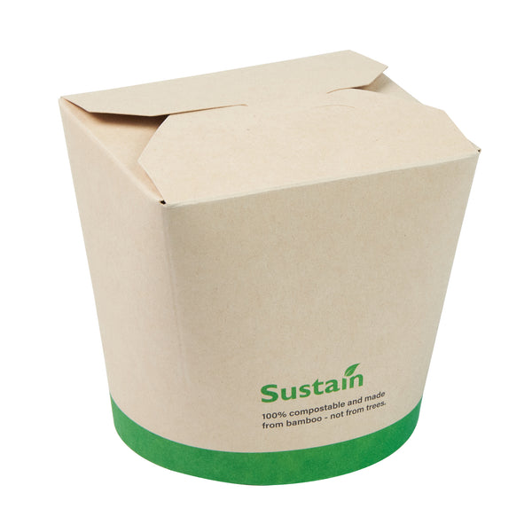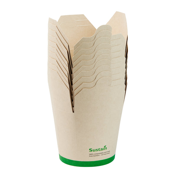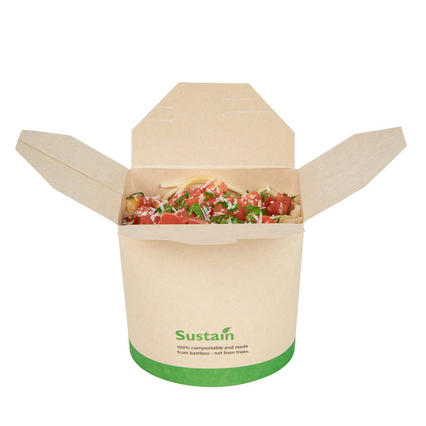 Ensure sustainable service with our compostable noodle container. The Sustain Leak-Resistant Compostable Noodle Container combines eco-friendly bamboo paper with a PLA lining, designed to prevent unwanted leaks and maintain a mess-free dining experience. With a secure tab-lock closure, this bamboo takeout container ensures meals stay intact, offering hassle-free transportation for busy foodservice operations. The commercially compostable paper supports eco-friendly disposal practices, aligning with sustainability goals and reducing environmental impact. At 4 inches in diameter and 3.5 inches in height, these containers are perfect for takeout and delivery services, food trucks, or catering events. Elevate your foodservice offerings with this eco-conscious solution that combines functionality and sustainability. Each order includes 200 Sustain Leak-Resistant Compostable Noodle Containers.