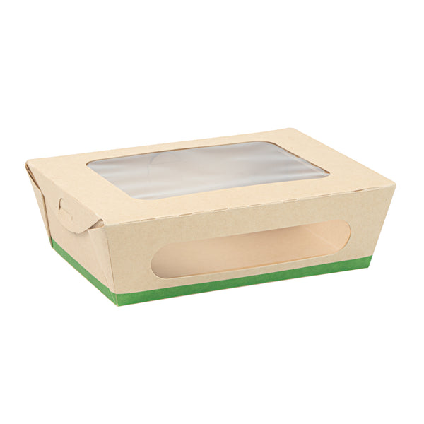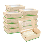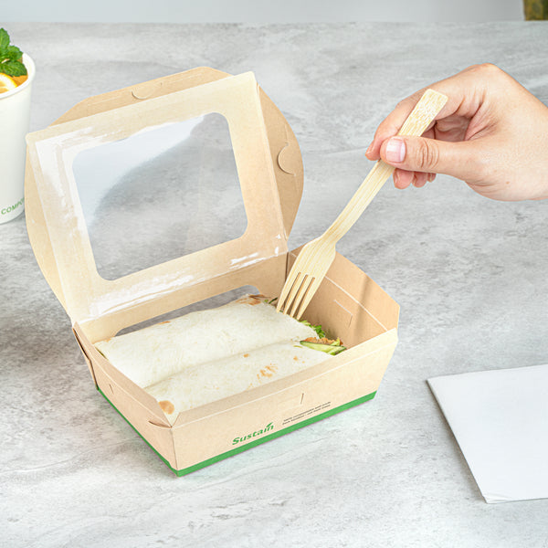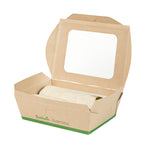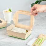 Ensure seamless service with leak-resistant, eco-friendly packaging. The Sustain Leak-Resistant Compostable Takeout Container features a PLA lining that prevents leaks, ensuring mess-free transport for your dishes. This compostable takeout container is crafted from sustainable paper, making it commercially compostable and supporting eco-friendly disposal practices. With dimensions of 6.3 inches in length, 4.7 inches in width, and 2 inches in height, this kraft paper food box is perfect for accommodating a variety of foods. The clear PLA windows enhance visibility, allowing customers to easily view and select their desired meals, making this clear window food box ideal for restaurants and cafes aiming to improve customer experience. Offer your patrons an environmentally responsible dining option without sacrificing convenience. Sold in a 200 count box.