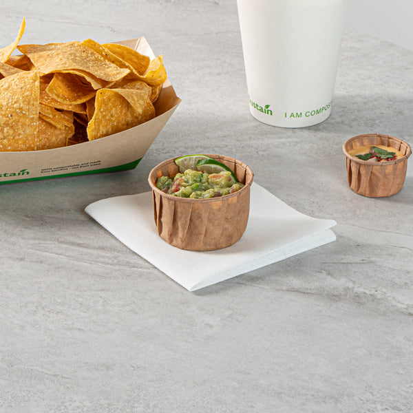 Elevate your food offerings with our Sustain 3.25-ounce Kraft Paper Portion Cups. These commercially compostable and biodegradable paper condiment cups provide an environmentally-conscious alternative to traditional plastic options. Crafted from premium paper, these condiment cups are designed to withstand thick barbecue sauce, chunky salsa, and more. Perfect for serving samples, these paper ketchup cups are versatile and a fantastic choice for events, tastings, and food promotions. The kraft finish of these paper sauce cups enhances your food presentation, adding a rustic charm. For hassle-free cleanup, these disposable sauce cups can be easily tossed after use. Measuring 2.48 inches in diameter by 1.61 inches in height, these ketchup cups offer a 3.25-ounce capacity, making them ideal for various condiments. Sold in a 100 count box. These items will only degrade outside of the traditional solid waste stream.