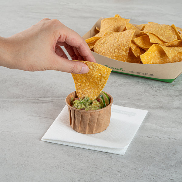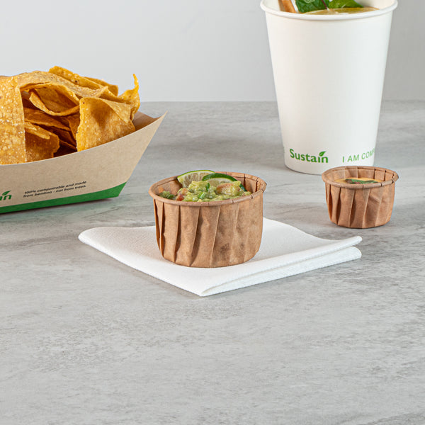 Elevate your food offerings with our Sustain 3.25-ounce Kraft Paper Portion Cups. These commercially compostable and biodegradable paper condiment cups provide an environmentally-conscious alternative to traditional plastic options. Crafted from premium paper, these condiment cups are designed to withstand thick barbecue sauce, chunky salsa, and more. Perfect for serving samples, these paper ketchup cups are versatile and a fantastic choice for events, tastings, and food promotions. The kraft finish of these paper sauce cups enhances your food presentation, adding a rustic charm. For hassle-free cleanup, these disposable sauce cups can be easily tossed after use. Measuring 2.48 inches in diameter by 1.61 inches in height, these ketchup cups offer a 3.25-ounce capacity, making them ideal for various condiments. Sold in a 2,000 count box. These items will only degrade outside of the traditional solid waste stream.