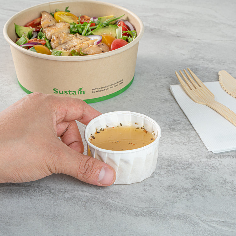 Enhance your foodservice with our Sustain 3.25-ounce White Paper Portion Cups. These paper condiment cups are commercially compostable and biodegradable, providing an eco-friendly alternative to traditional plastic. Made from premium paper, these durable condiment cups can hold thick barbecue sauce, chunky salsa, and more. With a versatile design, these paper ketchup cups are ideal for serving samples at events, tastings, and food promotions. The white finish of these paper sauce cups elegantly complements your food presentation. For hassle-free cleanup, these sauce cups are disposable and can be easily tossed after use. These ketchup cups measure 2.48 inches in diameter by 1.61 inches in height and have a capacity of 3.25 ounces. Sold in a 2,000 count box. These items will only degrade outside of the traditional solid waste stream.