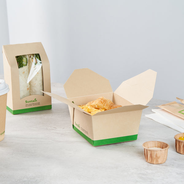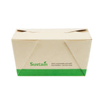 Secure your meals with eco-friendly reliability. The Sustain Bamboo Takeout Box offers a sustainable solution with its PLA lining, preventing leaks and ensuring mess-free storage for any foodservice operation. Boasting a generous 30-ounce capacity, it is the ideal compostable takeout container for serving hearty portions of entrees or fresh salads. This rectangular box, measuring 5.1 inches by 4.1 inches by 2.6 inches, provides ample space for elegant food presentation and easy stacking during transport. Its tab-lock closure secures meals, offering hassle-free transportation and peace of mind for caterers and restaurant owners alike. Crafted from commercially compostable paper, it supports eco-friendly foodservice operations by breaking down naturally after use, making it a perfect choice for sustainable culinary practices. Elevate your takeout and delivery services with this reliable and environmentally responsible packaging solution. Each order includes 200 Sustain Bamboo Takeout Boxes.