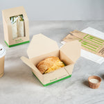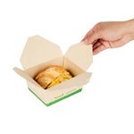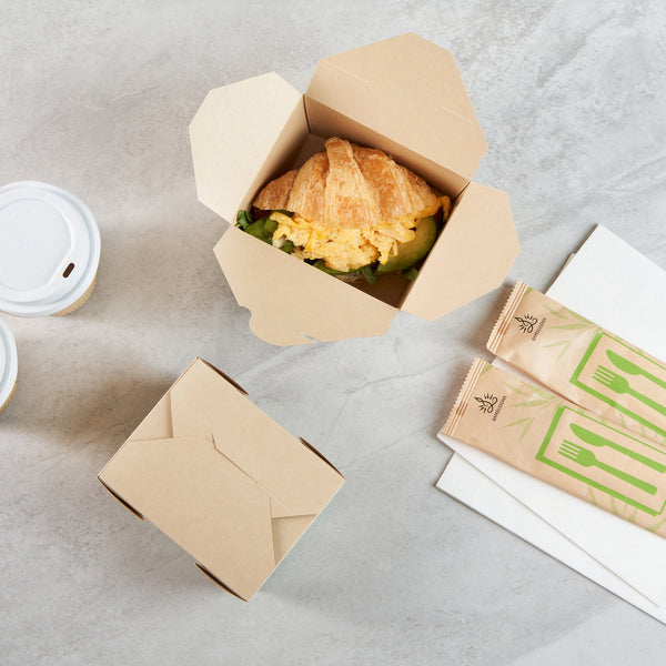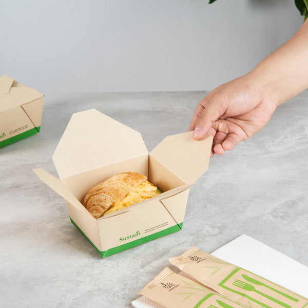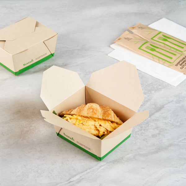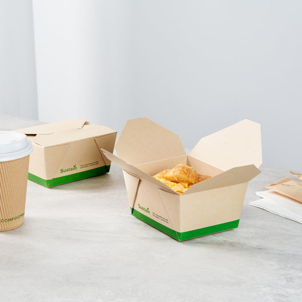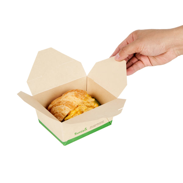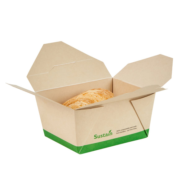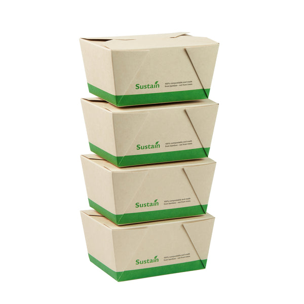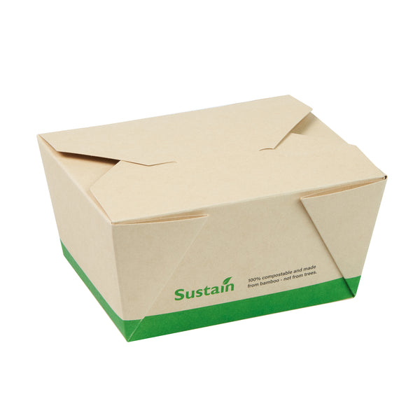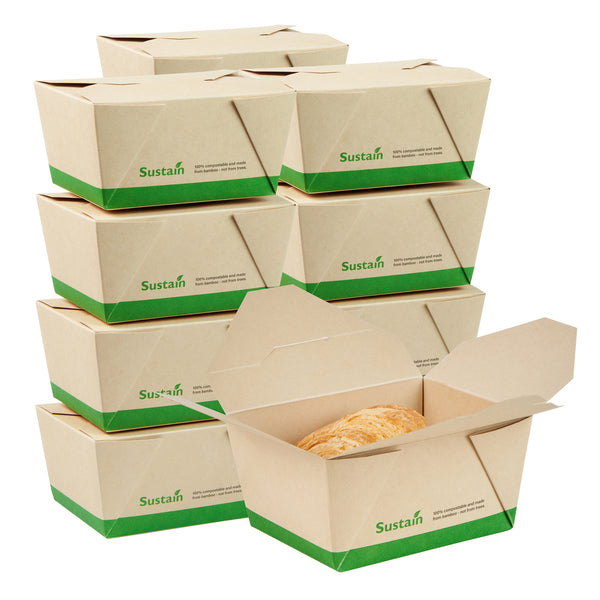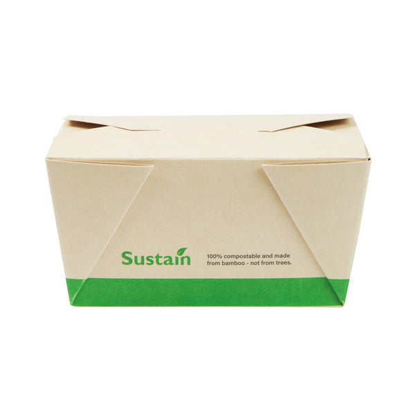 Secure your meals with eco-friendly reliability. The Sustain Bamboo Takeout Box offers a sustainable solution with its PLA lining, preventing leaks and ensuring mess-free storage for any foodservice operation. Boasting a generous 30-ounce capacity, it is the ideal compostable takeout container for serving hearty portions of entrees or fresh salads. This rectangular box, measuring 5.1 inches by 4.1 inches by 2.6 inches, provides ample space for elegant food presentation and easy stacking during transport. Its tab-lock closure secures meals, offering hassle-free transportation and peace of mind for caterers and restaurant owners alike. Crafted from commercially compostable paper, it supports eco-friendly foodservice operations by breaking down naturally after use, making it a perfect choice for sustainable culinary practices. Elevate your takeout and delivery services with this reliable and environmentally responsible packaging solution. Each order includes 50 Sustain Bamboo Takeout Boxes.