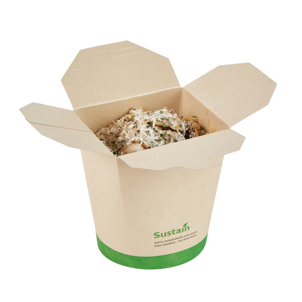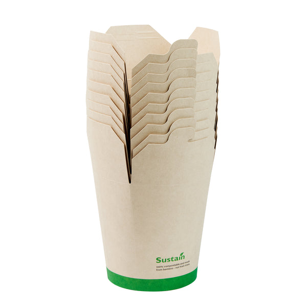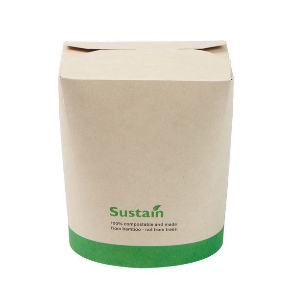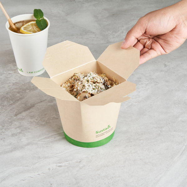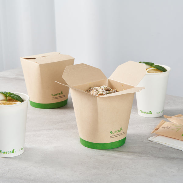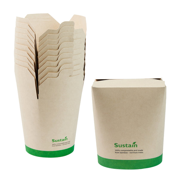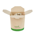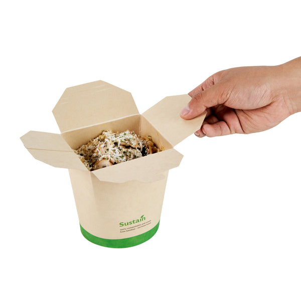 Ensure eco-friendly meal delivery with reliable leak resistance. The Sustain Leak-Resistant Noodle Take Out Container features a PLA lining that prevents leaks, ensuring hassle-free transport and maintaining the integrity of your dishes. With a tab-lock closure, this kraft takeout container secures meals during delivery, reducing the risk of spills and keeping food intact. Made from sustainable, commercially compostable paper, it supports environmentally-conscious practices and simplifies disposal. Measuring 4 inches in length, 3.5 inches in width, and 4.5 inches in height, this 32 oz takeout container offers ample space for hearty meals, while its kraft color adds a rustic aesthetic to your packaging. Trust in its biodegradable and greaseproof properties to enhance your foodservice operations with both practicality and sustainability. Each order includes 200 Sustain Leak-Resistant Noodle Take Out Containers.