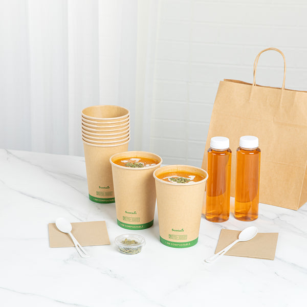 Effortlessly serve your customers their favorite soups with our Sustain 32-ounce Round Kraft Paper Soup Containers. These BPI-certified commercially compostable paper food cups help reduce waste and minimize your carbon footprint. The leak-resistant design of these take out soup bowls prevents messes, ensuring safe transportation of soups, stews, and noodles at any temperature. Suitable for both hot and cold foods, this durable paper food cup is perfect for versatile menu offerings. These hot food paper cups are stackable, providing easy storage for busy kitchens. Measuring 4.53 inches in diameter by 5.79 inches in height, these kraft soup containers accommodate a generous 32-ounce capacity. Sold in a 25 count box.