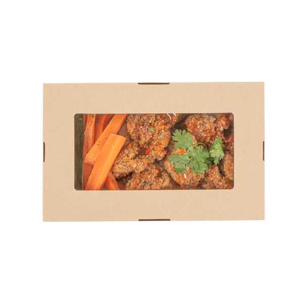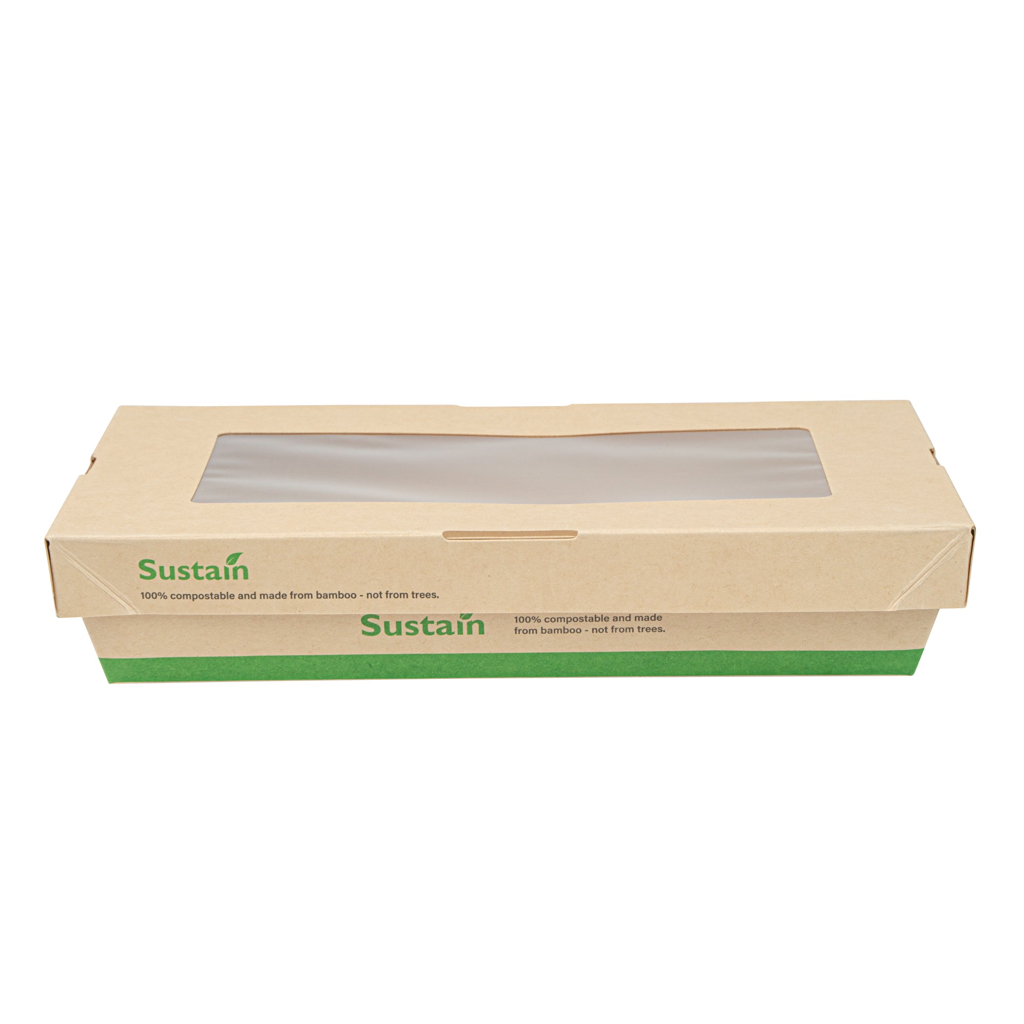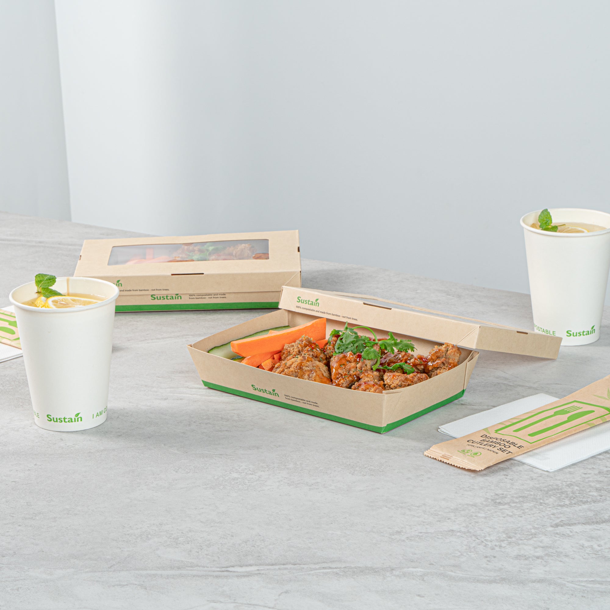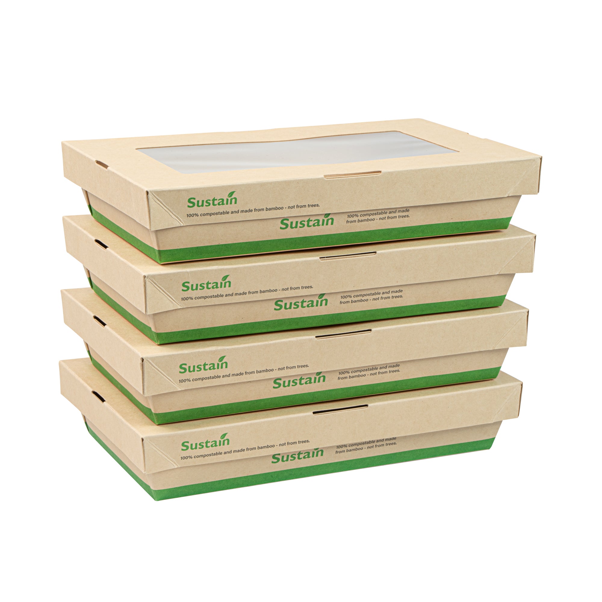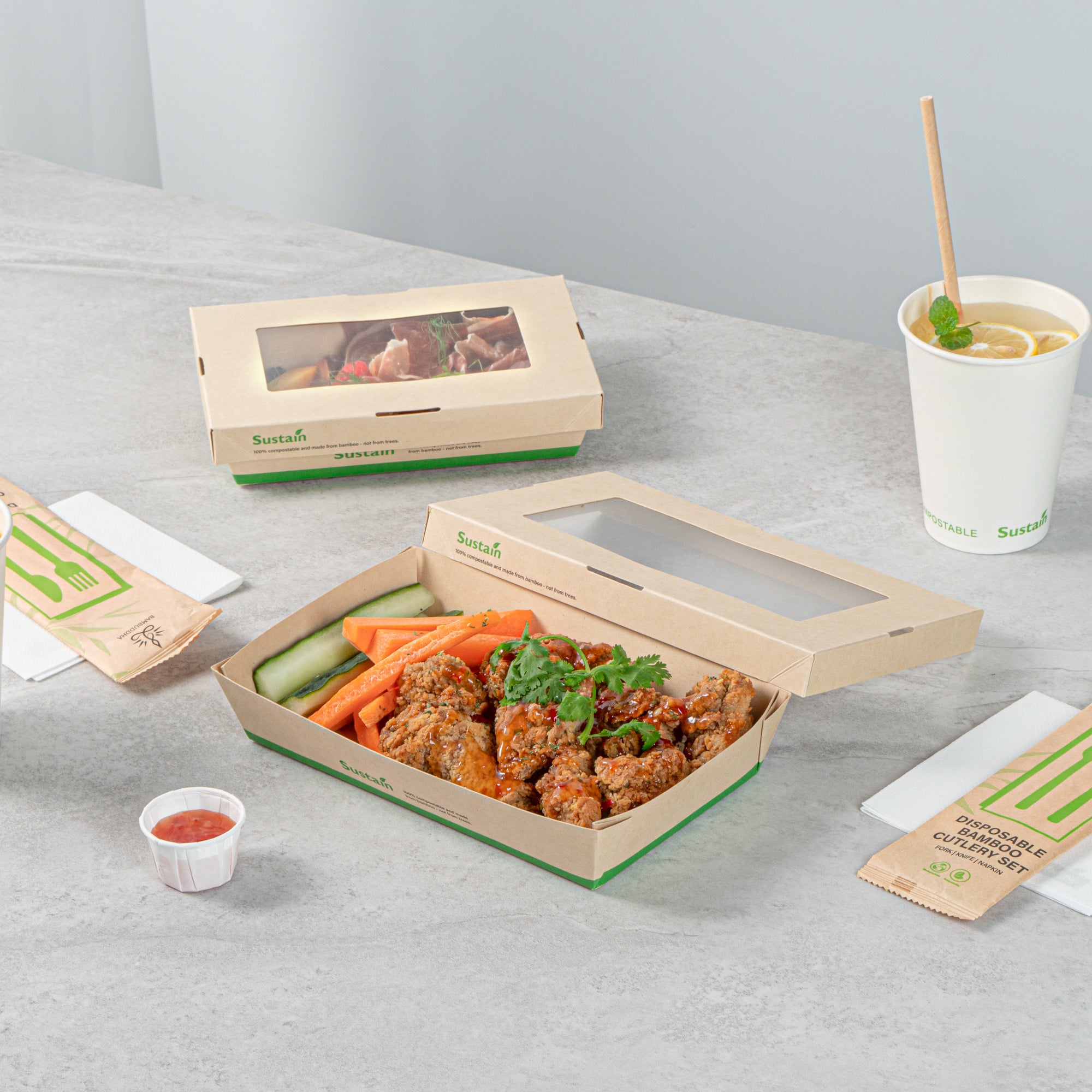 Reduce environmental impact with leak-resistant, sustainable packaging. Sustain Leak-Resistant Kraft Paper Compostable Takeout Containers feature a PLA lining that prevents leaks, ensuring a mess-free dining experience for your customers. The clear PLA window allows patrons to easily view the delicious contents of these microwave-safe takeout boxes, enhancing their dining experience. Made from commercially compostable paper, these kraft paper food containers support eco-friendly practices, making them an excellent choice for environmentally conscious restaurants. With dimensions of 8.5 inches in length, 5.3 inches in width, and 1.6 inches in height, they are perfectly sized to accommodate a variety of meals while maintaining a professional presentation. Choose these greaseproof and biodegradable containers to elevate your foodservice operations with a sustainable solution. Sold in a 200 count box.