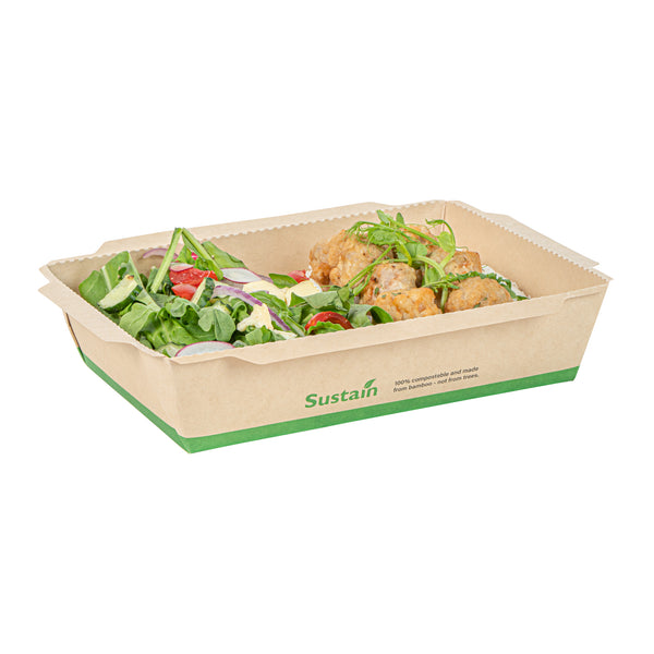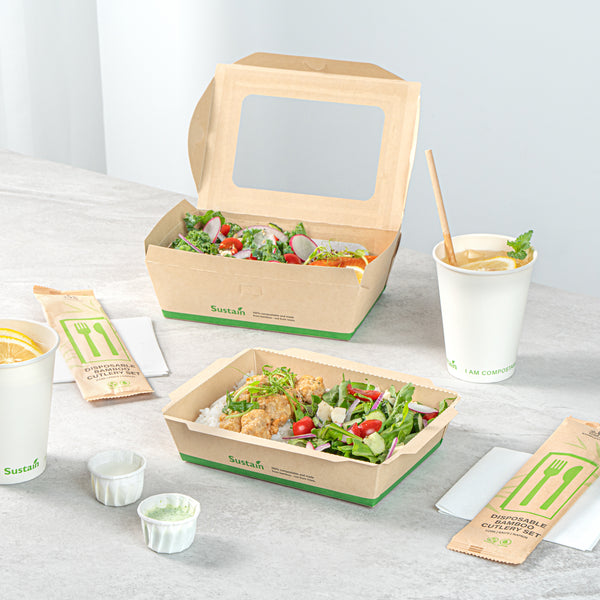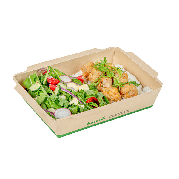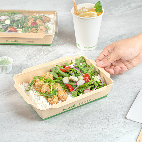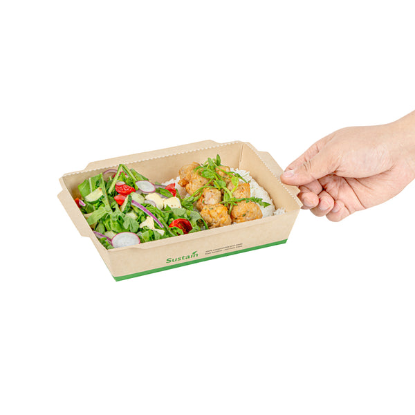 Enhance meal presentation with a reliable takeout food container. The Sustain Leakproof Kraft Click Lock Takeout Food Container, made from sustainable paper with a protective PLA lining, prevents unwanted leaks, ensuring food remains intact during transport. Its innovative click lock mechanism secures contents, making it ideal for delivery services looking to maintain food integrity. With a generous 34-ounce capacity and greaseproof construction, this compostable takeout container is perfect for serving generous portions without compromising quality or appearance. Measuring 7.5 inches in length and 5.5 inches in width, it easily accommodates a variety of dishes. As a compostable paper solution, it supports eco-friendly disposal practices, appealing to environmentally conscious businesses. Make sure your meals are delivered securely and sustainably by choosing this food container. Each order includes 50 Sustain Leakproof Kraft Click Lock Takeout Food Containers.