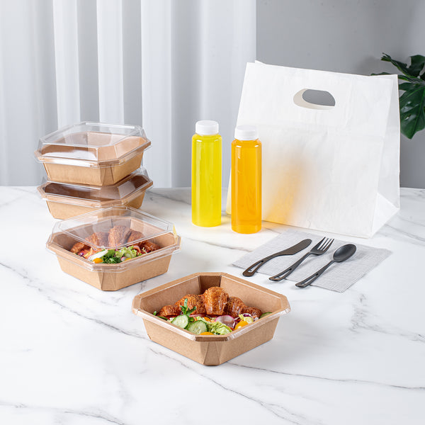 The octagonal shape of these take out containers optimizes space utilization, allowing for efficient packing. Plus, the geometric design elevates the food presentation.