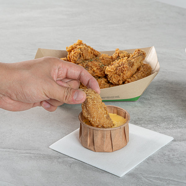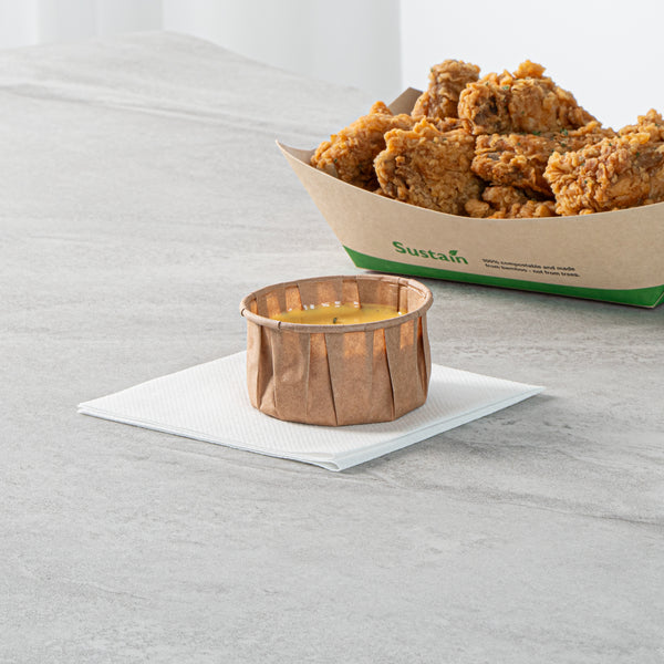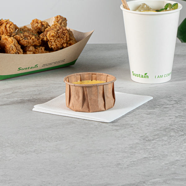 Elevate your food presentation with our Sustain 4-ounce Kraft Paper Portion Cups. These paper condiment cups are commercially compostable and biodegradable, offering an eco-friendly alternative to traditional plastic. Made from premium paper, these durable condiment cups are ideal for holding thick barbecue sauce, chunky salsa, and more. Perfect for serving samples, these versatile ketchup cups are an excellent choice for events, tastings, and food promotions. The kraft finish of these paper ketchup cups complements your food presentation beautifully. For straightforward cleanup, these disposable sauce cups can be tossed after use. These paper sauce cups measure 2.76 inches in diameter by 1.69 inches in height and have a capacity of 4 ounces. Sold in a 100 count box. These items will only degrade outside of the traditional solid waste stream.
