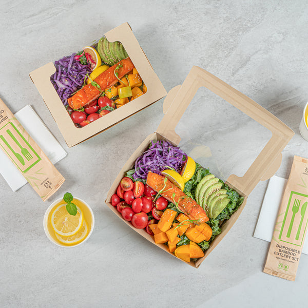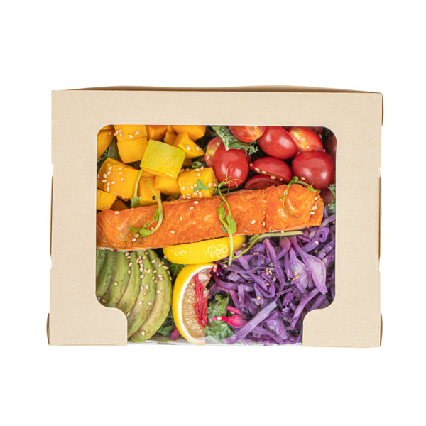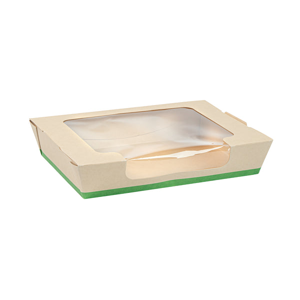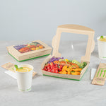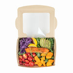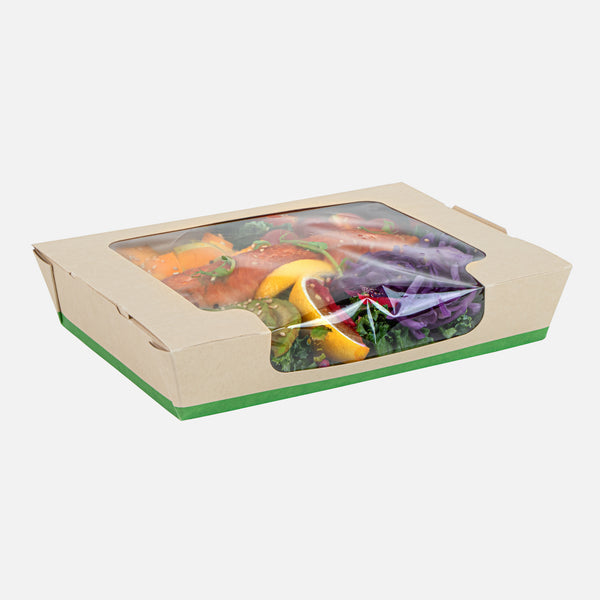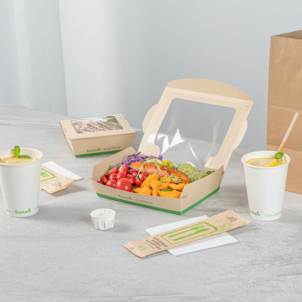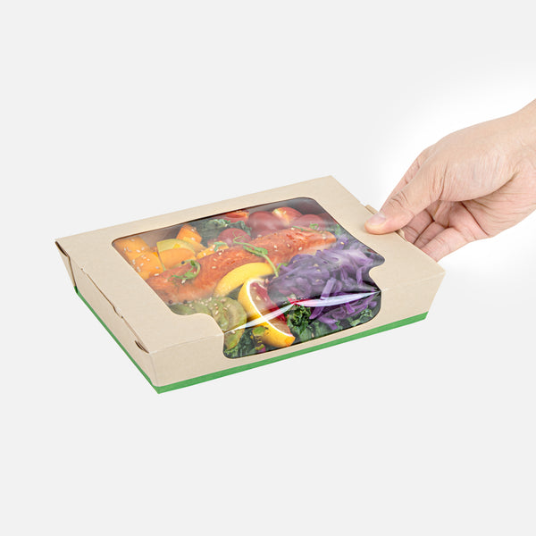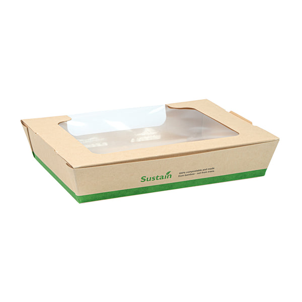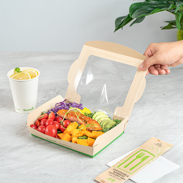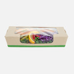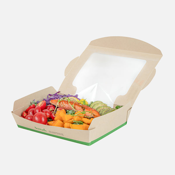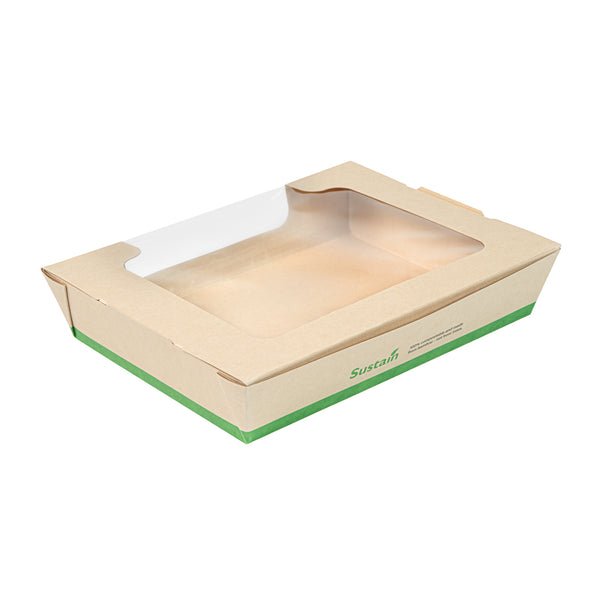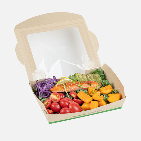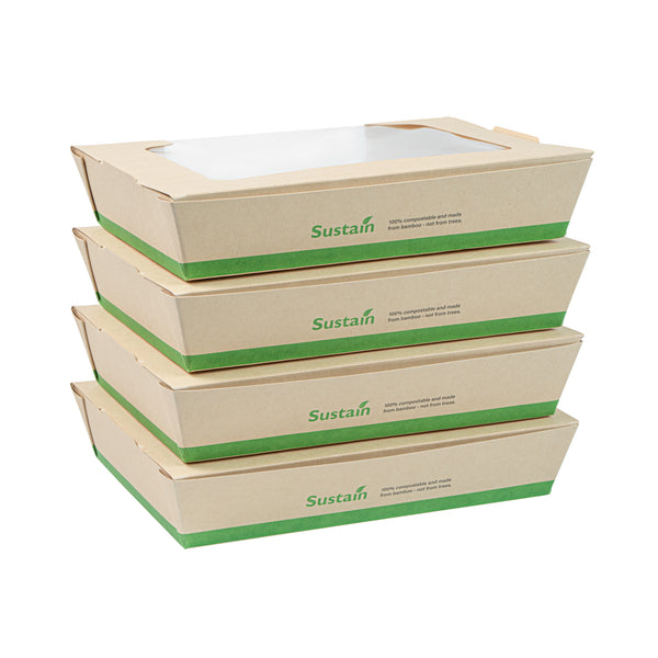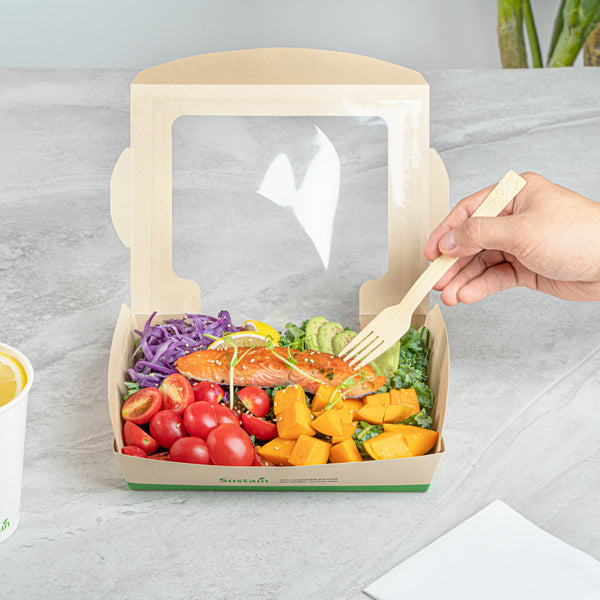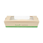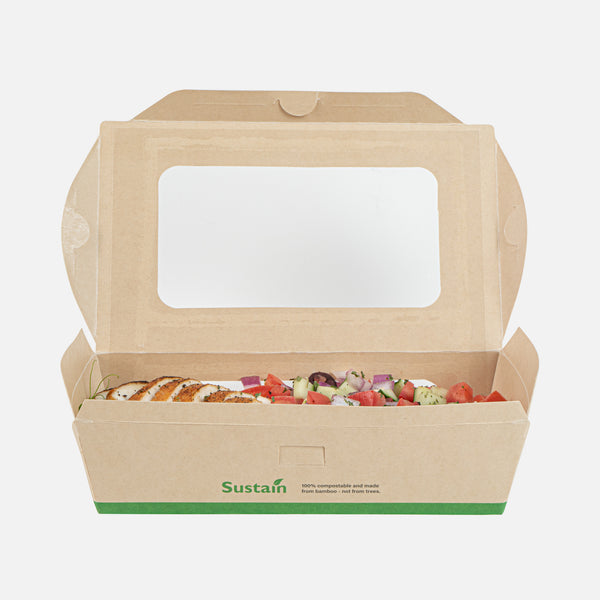 Prevent messy spills with our sustainable, compostable containers. The Sustain Leak-Resistant Rectangular Food Container features a PLA lining that ensures a mess-free service by effectively preventing leaks, making it an ideal choice for your foodservice needs. This rectangular food container, crafted from sustainable paper and measuring 8.3 inches in length, includes a clear PLA window that allows customers to effortlessly view the contents, enhancing the appeal of your culinary creations. Its commercially compostable paper construction supports eco-friendly disposal, aligning with your commitment to sustainability and reducing environmental impact. With a capacity of 40 ounces, this compostable salad container is perfect for serving salads, entrees, and more, accommodating a wide variety of menu items. Elevate your takeout presentation and reinforce your eco-conscious brand with this dependable takeout salad box. Sold in a 50 count box.