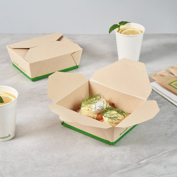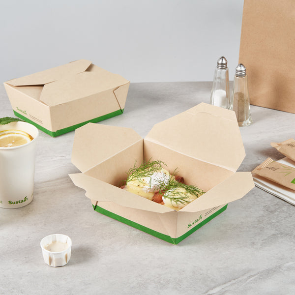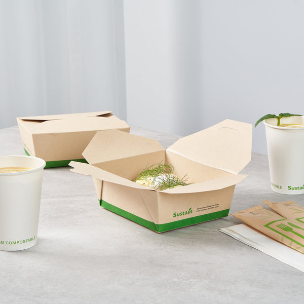 Ensure secure meal delivery with our Sustain Leak-Resistant Kraft Paper Takeout Container. Designed with a robust PLA lining, this takeout container effectively prevents leaks, ensuring a mess-free service for your patrons. The convenient tab-lock closure keeps meals intact during transport, making it an ideal to-go box for restaurants and catering businesses focused on maintaining meal presentation. Crafted from sustainably sourced paper, these disposable food containers are commercially compostable, supporting eco-friendly disposal practices and appealing to environmentally conscious consumers. Measuring 6.75 inches in length, 5.5 inches in width, and 2.6 inches in height, each container accommodates up to 45 ounces, providing ample space for various dishes. Enhance your service with reliable, biodegradable packaging that aligns with your sustainability goals. Each order includes 50 Sustain Leak-Resistant Kraft Paper Takeout Containers.
