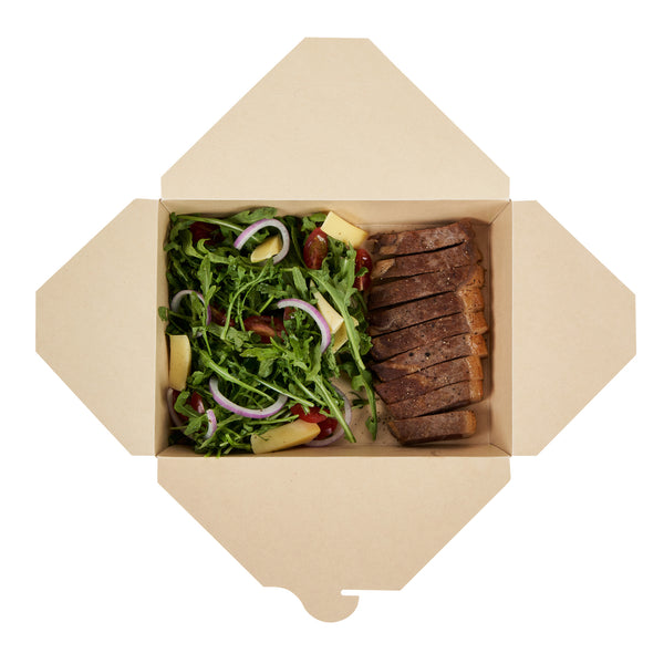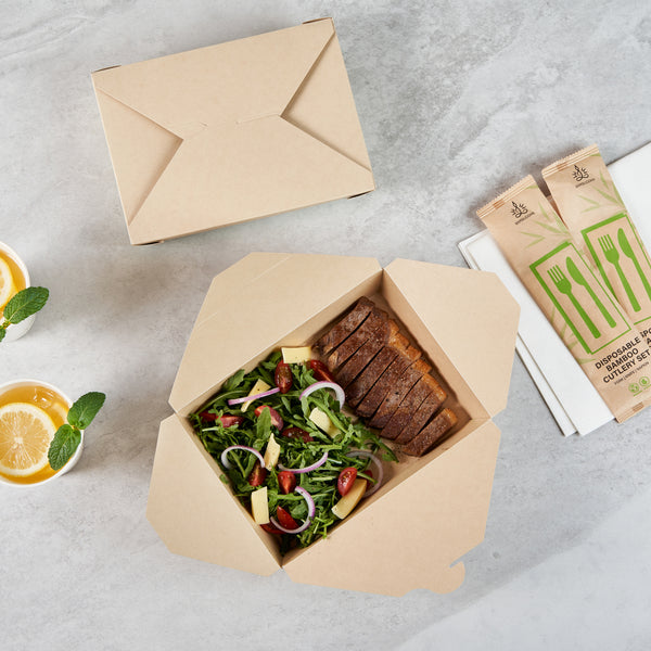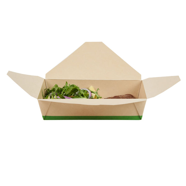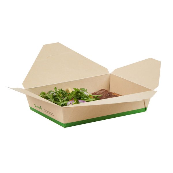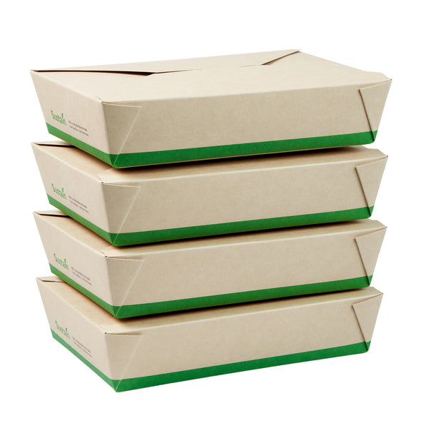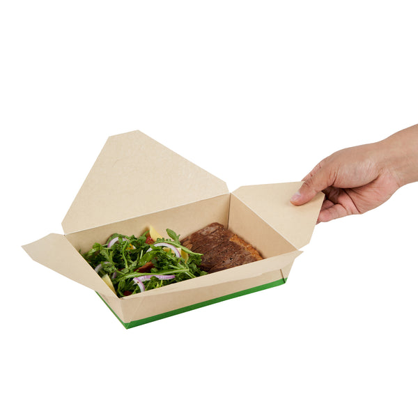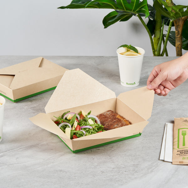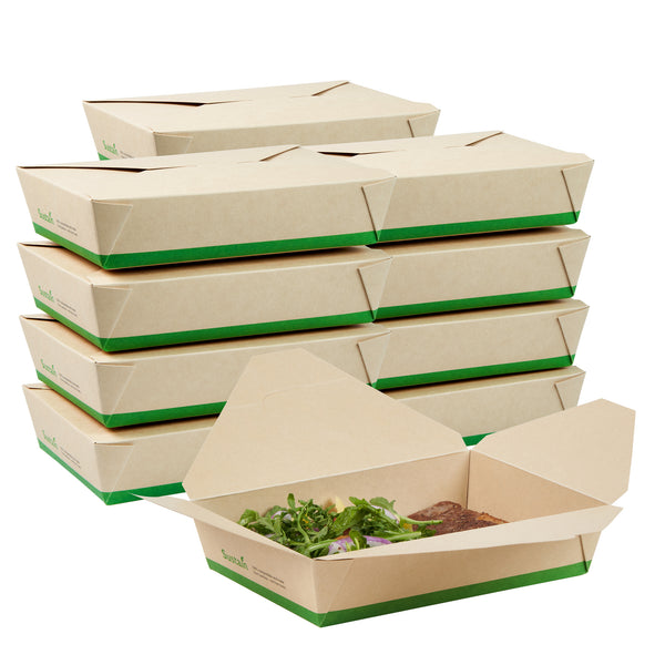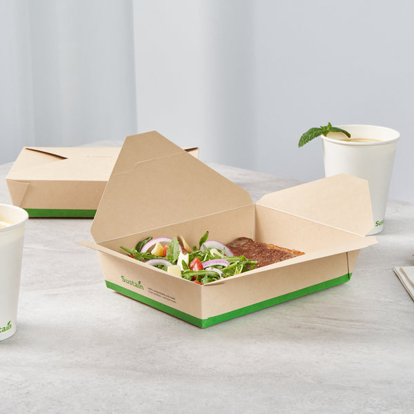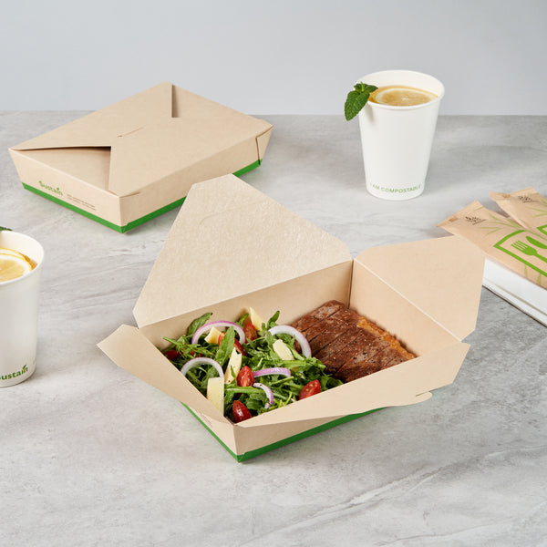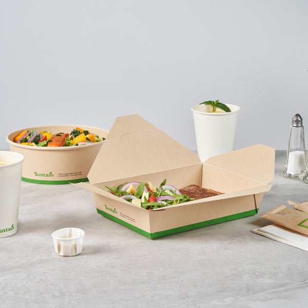 Ensure eco-friendly meal transport with leak-proof efficiency. The Sustain Leak-Resistant Biodegradable Takeout Container features a PLA lining that prevents leaks, ensuring mess-free service for your food establishment. Designed with a secure tab-lock closure, this biodegradable takeout container keeps meals intact during transport, offering a hassle-free experience for your customers. Crafted from sustainable paper, this container is commercially compostable, allowing for responsible disposal in composting facilities. With dimensions of 8.5 inches in length, 6.2 inches in width, and 1.9 inches in height, this compostable to-go box is perfect for packaging a variety of meals, from salads to entrees. Ideal for restaurants seeking environmentally conscious solutions, this takeout box is also greaseproof, providing reliable protection against oil and sauce spills. Enhance your foodservice operations with this kraft-colored container that combines functionality and sustainability. Each order includes 50 Sustain Leak-Resistant Biodegradable Takeout Containers.