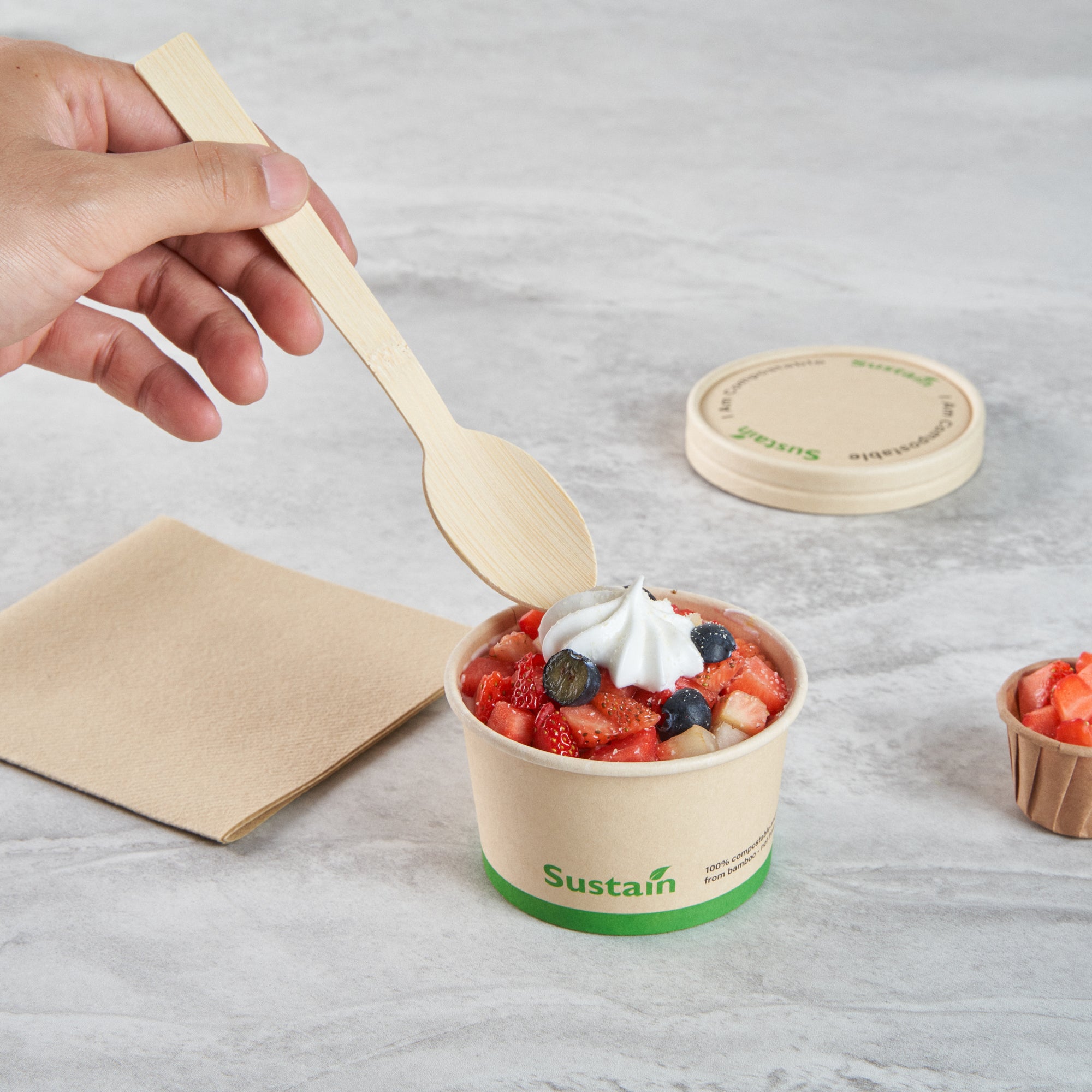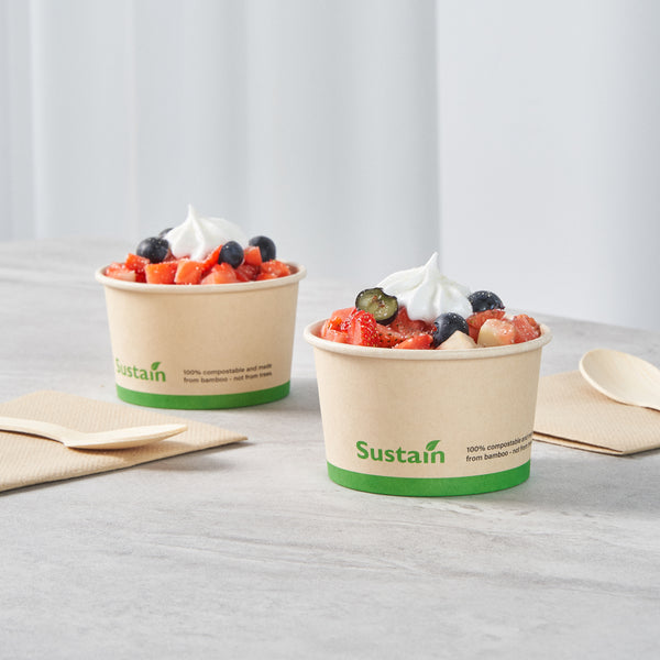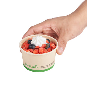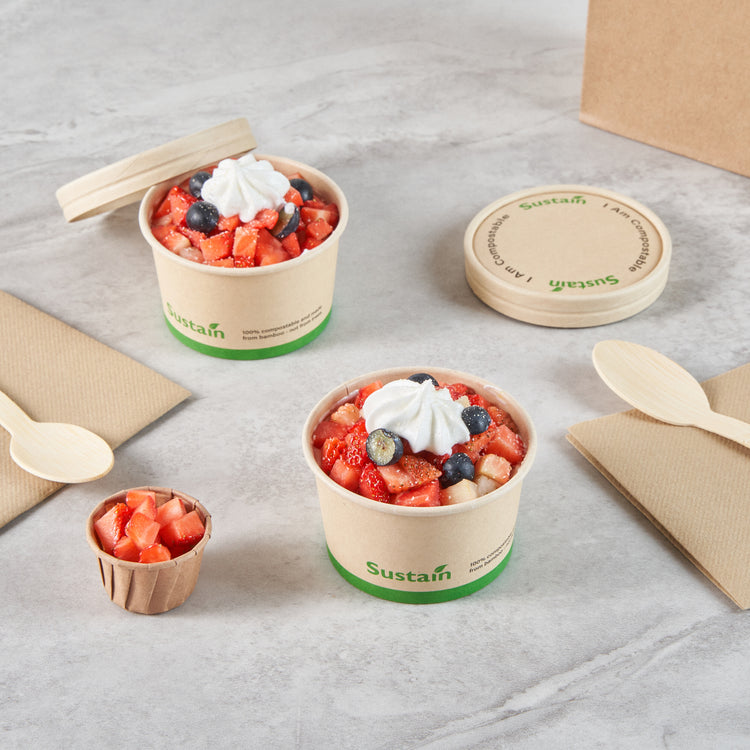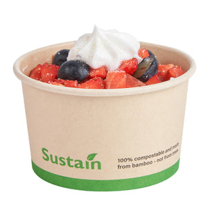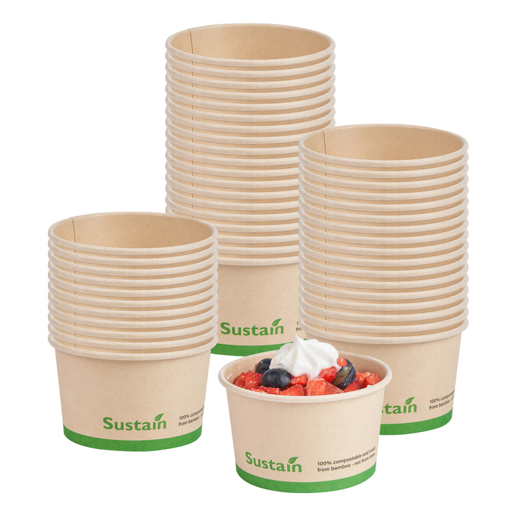 Prevent unwanted spills with our eco-friendly bamboo paper cups. The Sustain Leak-Resistant Bamboo Paper Cups feature a PLA lining that prevents leaks, ensuring a mess-free service and optimal customer satisfaction. With a rolled rim design, these compostable cups seal securely with coordinating lids, maintaining the cup’s integrity even when filled with hot foods. Crafted from sustainably sourced, commercially compostable paper, these biodegradable paper cups support eco-friendly disposal and reduce environmental impact. Each cup measures 3.3 inches in length, 3.3 inches in width, and 1.9 inches in height, offering a compact yet efficient design for your service needs. The kraft color adds a rustic touch, while the greaseproof material enhances durability, making them ideal for high-volume cafes. Enhance your foodservice operations with a reliable and sustainable cup. Each order includes 200 Sustain Leak-Resistant Bamboo Paper Cups.