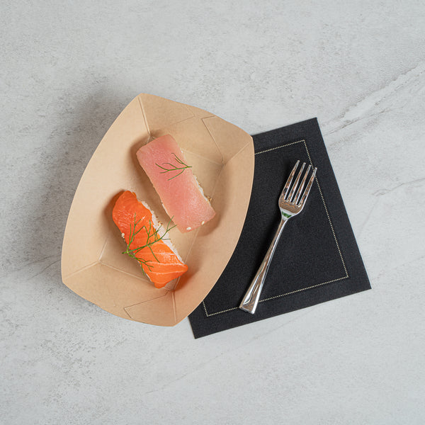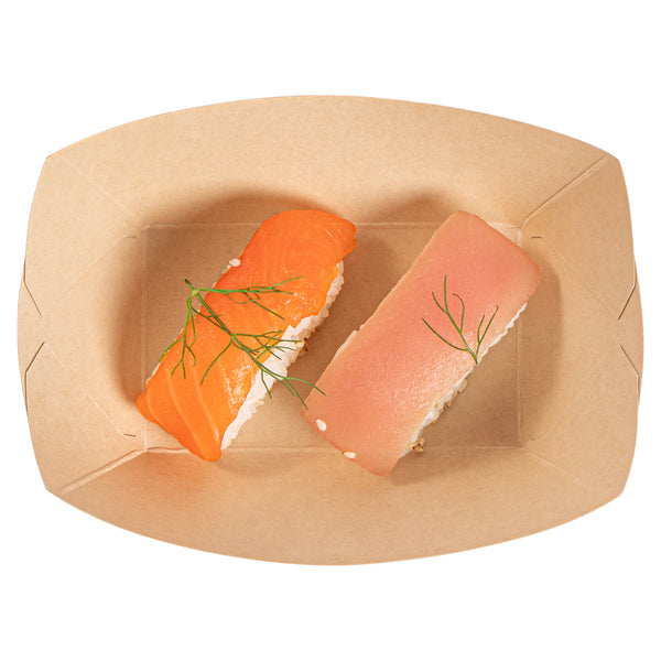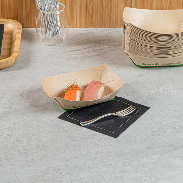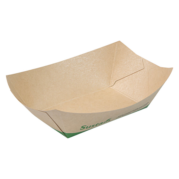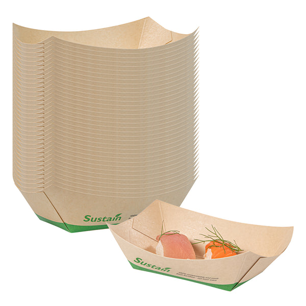 Enhance your foodservice operations with eco-friendly serving solutions. The Sustain Kraft Paper Compostable Food Boat features a PLA lining that prevents leaks, ensuring clean and professional presentations for your culinary creations. Its durable paper construction resists bending, making it ideal for showcasing appetizers or samplers without compromising on sturdiness. With its compostable design, this biodegradable serving tray supports eco-friendly disposal practices, helping your business align with sustainability initiatives. Measuring 3.25 inches in length, 2 inches in width, and 1.5 inches in height, this kraft paper food tray offers a compact yet functional option for serving small portions, appetizers, or side dishes. Perfect for high-volume settings, it reduces the need for frequent reordering and guarantees you always have a compostable food boat ready to serve your customers. Each order includes 400 Sustain Kraft Paper Compostable Food Boats.