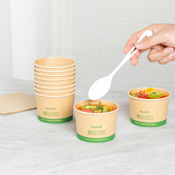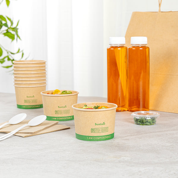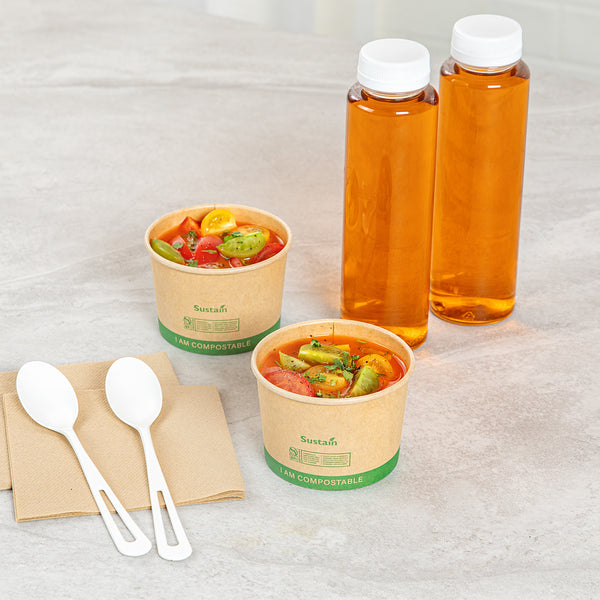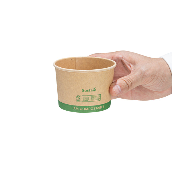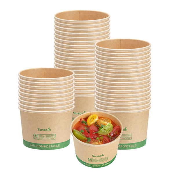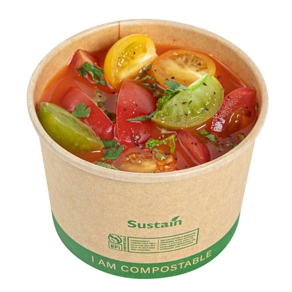 Our Sustain 8-ounce Round Kraft Paper Soup Containers are the perfect eco-friendly solution for your foodservice needs. These kraft soup containers are made from commercially compostable paper with BPI certitifcation, helping to reduce waste and minimize your carbon footprint. Designed with a leak-resistant feature, these paper food cups prevent messes and ensure safe transportation of soups, stews, noodles, and more at any temperature. The durable material of these take out soup bowls is ideal for serving both hot and cold foods. For convenient storing, these to go food containers are stackable, saving valuable space in your kitchen. Measuring 3.54 inches in diameter by 2.44 inches in height, this hot food paper cup has a total capacity of 8 ounces. Sold in a 200 count box.