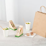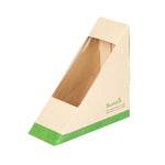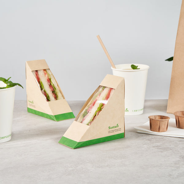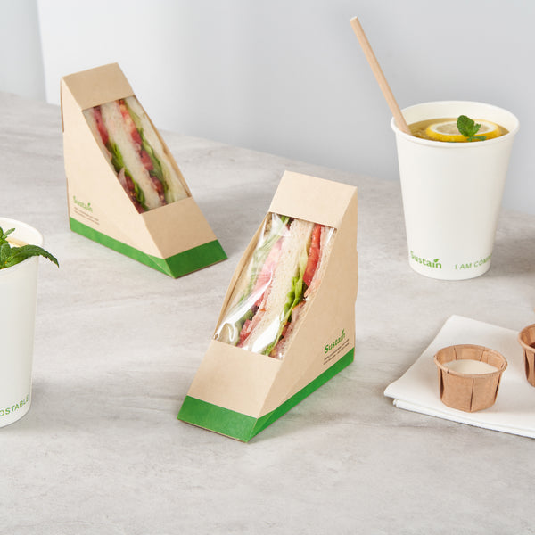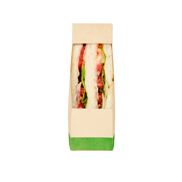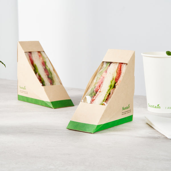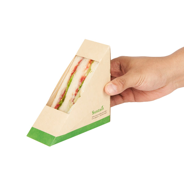 Enhance customer satisfaction with eco-friendly sandwich solutions. Sustain Kraft Paper Sandwich Container with a leak-resistant clear window combines sustainable paper with a PLA lining to prevent leaks, maintaining product integrity during transport. This compostable sandwich box is crafted from biodegradable paper, offering an environmentally conscious disposal option that reduces waste in foodservice operations. The clear window sandwich box design showcases the contents, making it easy for customers to spot their favorite sandwich, boosting customer appeal and increasing impulse purchases. Measuring 4.8 inches in length, 4.8 inches in width, and 2 inches in height, this sandwich container is ideal for standard sandwich portions, optimizing packaging efficiency in delis and cafés. Elevate your green initiatives while preserving product quality with this innovative sandwich packaging. Each order includes 50 Sustain Kraft Paper Sandwich Containers.