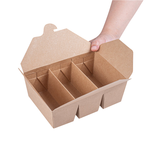 Keep your tacos and sides perfectly organized with our Sustain Kraft Paper Taco Take out Containers. Designed with 3 separate compartments, these take out boxes ensure that tacos, sides, and sauces stay divided for a mess-free presentation. The interior features a PLA lining, providing added durability and leak protection, making these taco containers ideal for both saucy dishes and dry cold foods. A reliable tab lock lid keeps your meals secure during delivery, making these take out food containers an excellent choice for safe transport. Crafted from compostable kraft paper, these takeaway boxes are an eco-conscious solution that helps reduce your environmental impact. Measuring 7.5 inches in length by 5.5 inches in width by 2 inches in height, these containers easily hold three tacos or hot dogs. Sold in a 100 count box.